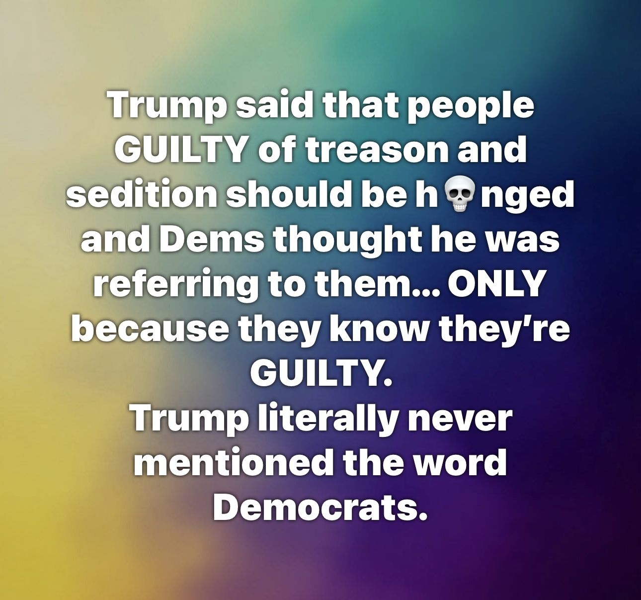 I don't believe he will do anything about it. It's just disgusting to see a President call for the death of his political opponents. Weren't you guys up in arms over "violent political rhetoric" just a few months ago after Charlie Kirk was murdered?How do you reconcile thinking DJT is the biggest liar ever, while also hanging on his every word?