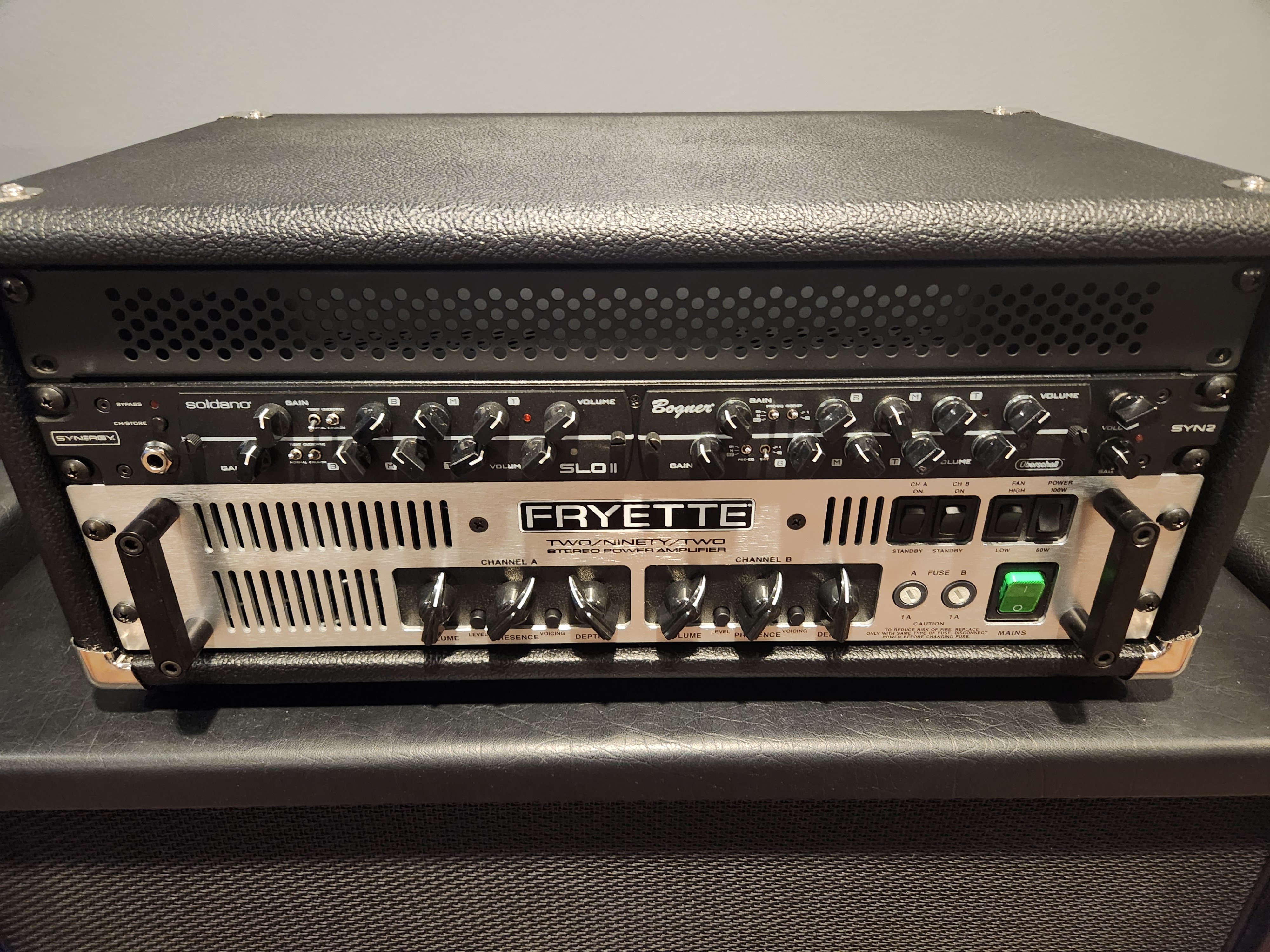 Fryette 2/90/2 stereo power amp , Syn 2, Soldano SLO II and Bogner Uberschall module, black tolex rack headshell along with the Synergy midi footswitch..