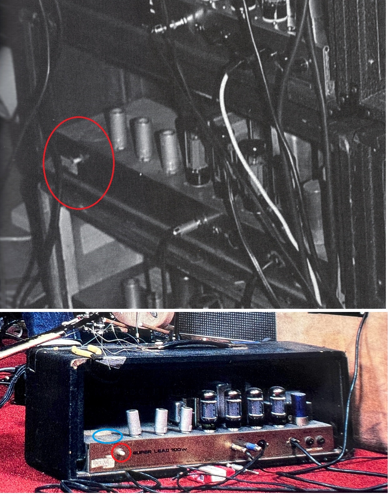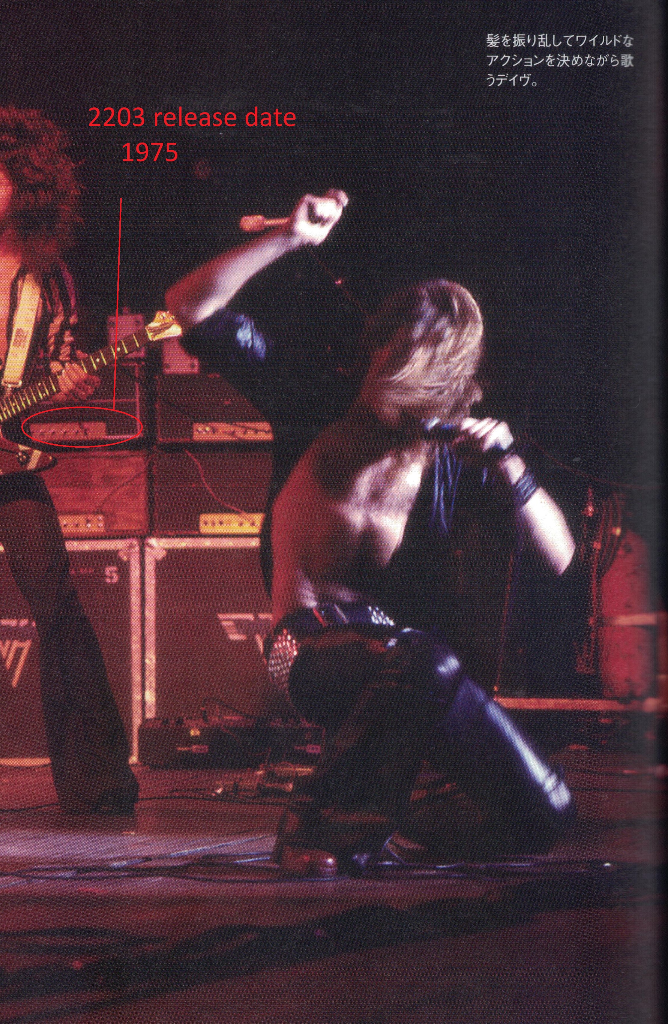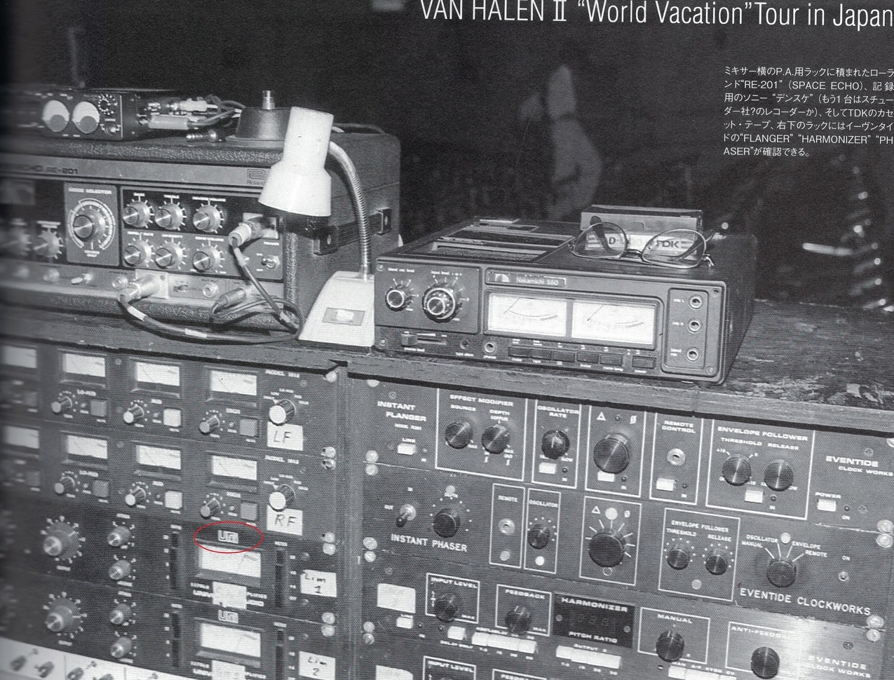 Next thing we can see is that the original amp that was used for the records is the second from the bottom left in this picture. You can clearly see that the potentiometer or button which has been present during the VH2 records was already present in 1978 during the japanese tour which means that it was probably already there during the recording session of VH1. Dave Friedman made the mistake to say that there was no potentiometer in the 1978 pictures because he only got access to the blurry version of this picture.