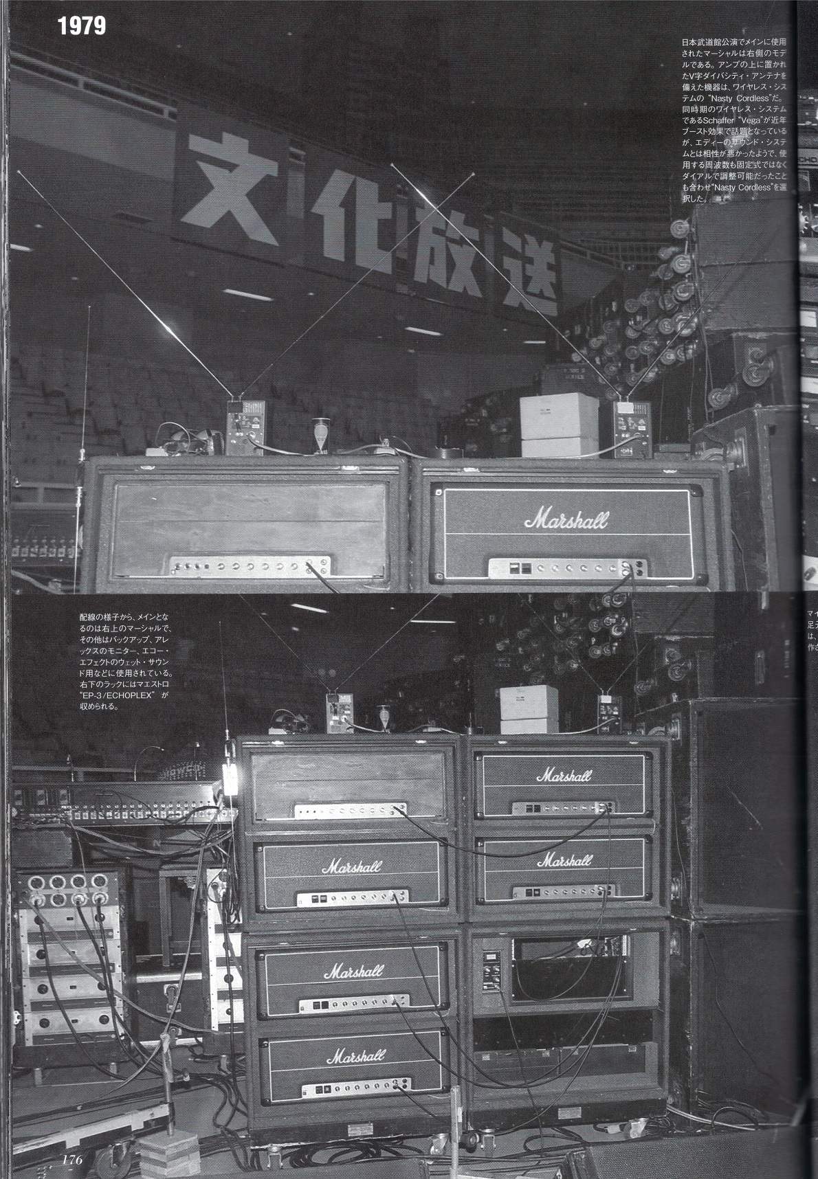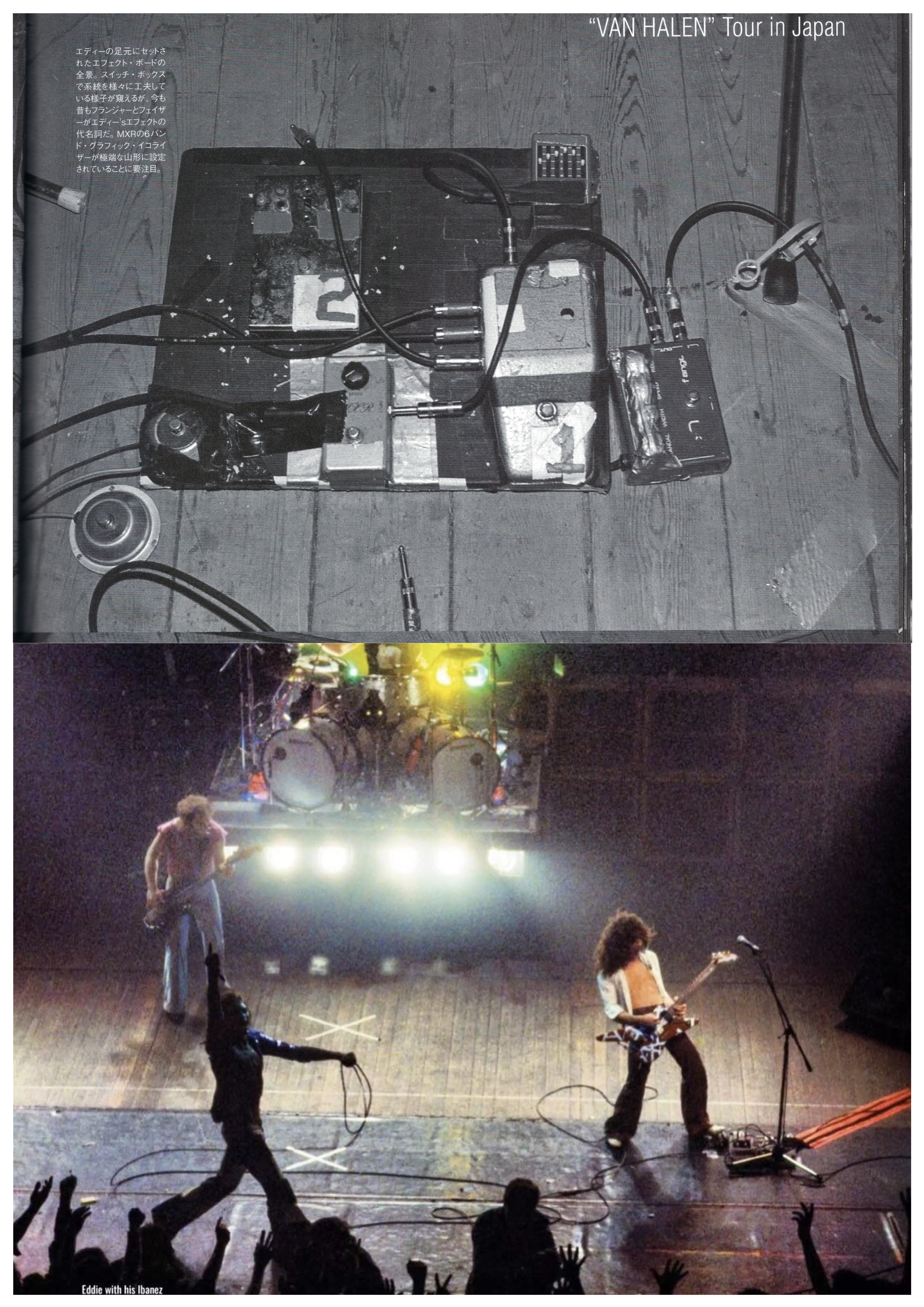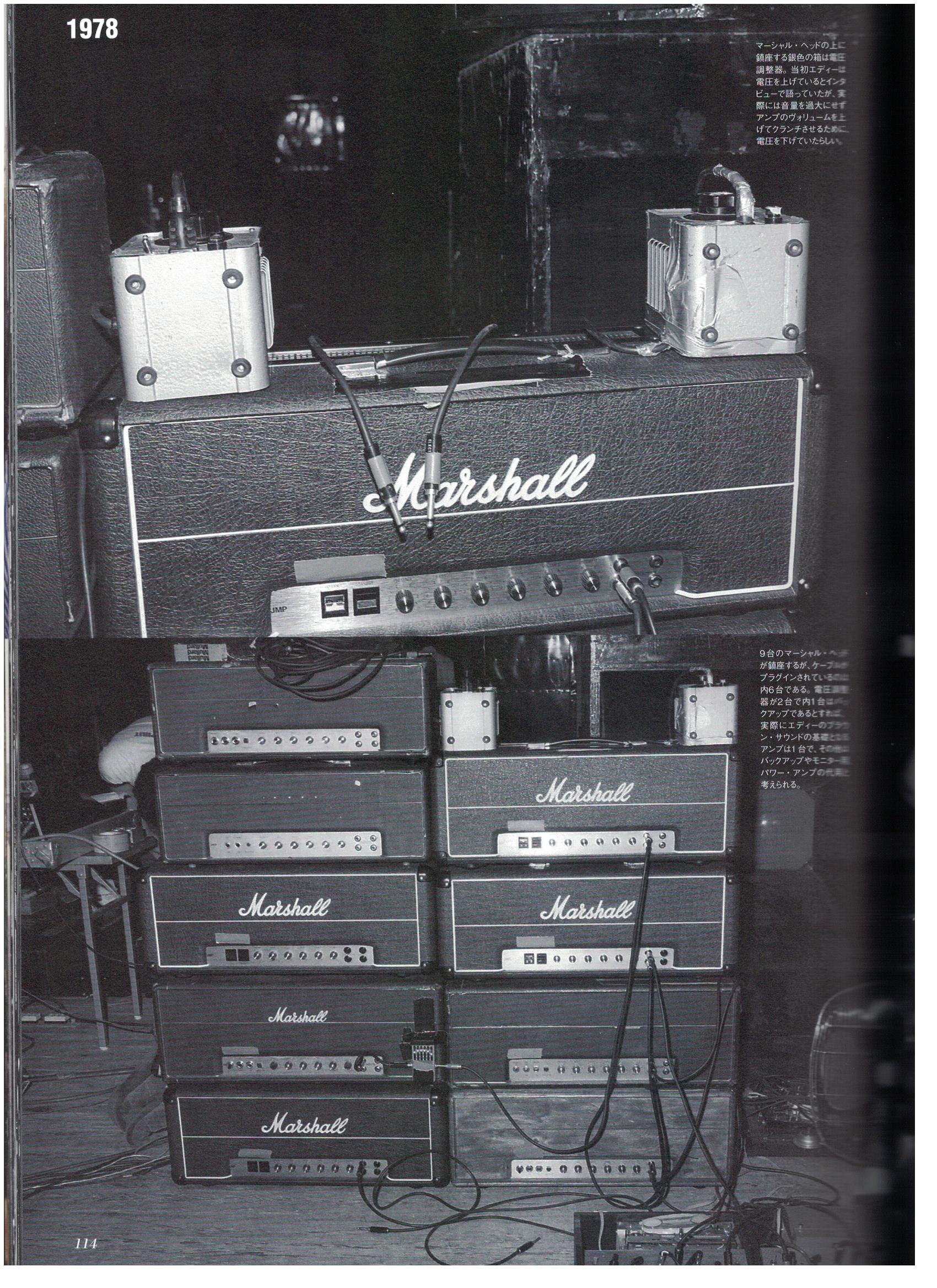 This is the VH2 tour in japan. You can clearly see the schaffer vega unit at the bottom of the amps on the right. You can see that the amps are in majority Mark 2 plexis except the old wood one. You can also see on the top another wireless system called the Nasty Cordless or named later Nady Cordless those systems had a boost for guitar incorporated in their units. Eddie seems to use the Nady for it's guitar and schaffer as a boost only. The schaffer Vega unit is where a lot of the gain comes from. If you didn't know this is a wireless unit which could boost your signal and increased its gain. It was used by angus young and many other guitar players to boost their plexis in the 70's. It also had it's own compressor/limiter. We are very lucky because solodallas reproduced the schaffer unit as a pedal called the schaffer storm which is a faithfull reproduction of how the unit impacted the tone. I don't know if you guys used the shaffer storm with a plexi the result is quite impressive. You get tons of gain. I also tried it with my vintage mxr 6 band eq and it nulifies the noise coming from the EQ. Everything becomes way easier to play.