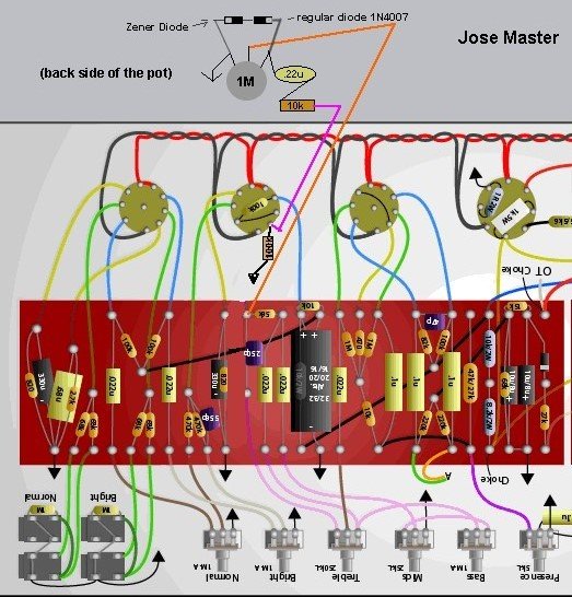 this is the josé 50w it also has eddie preamp board with some few mods. I have one of its inputs that's stock without the extra gain stage and even with a 330k plate resistor it's not enough gain to sustain the RWTD main riff alone without vibrato.