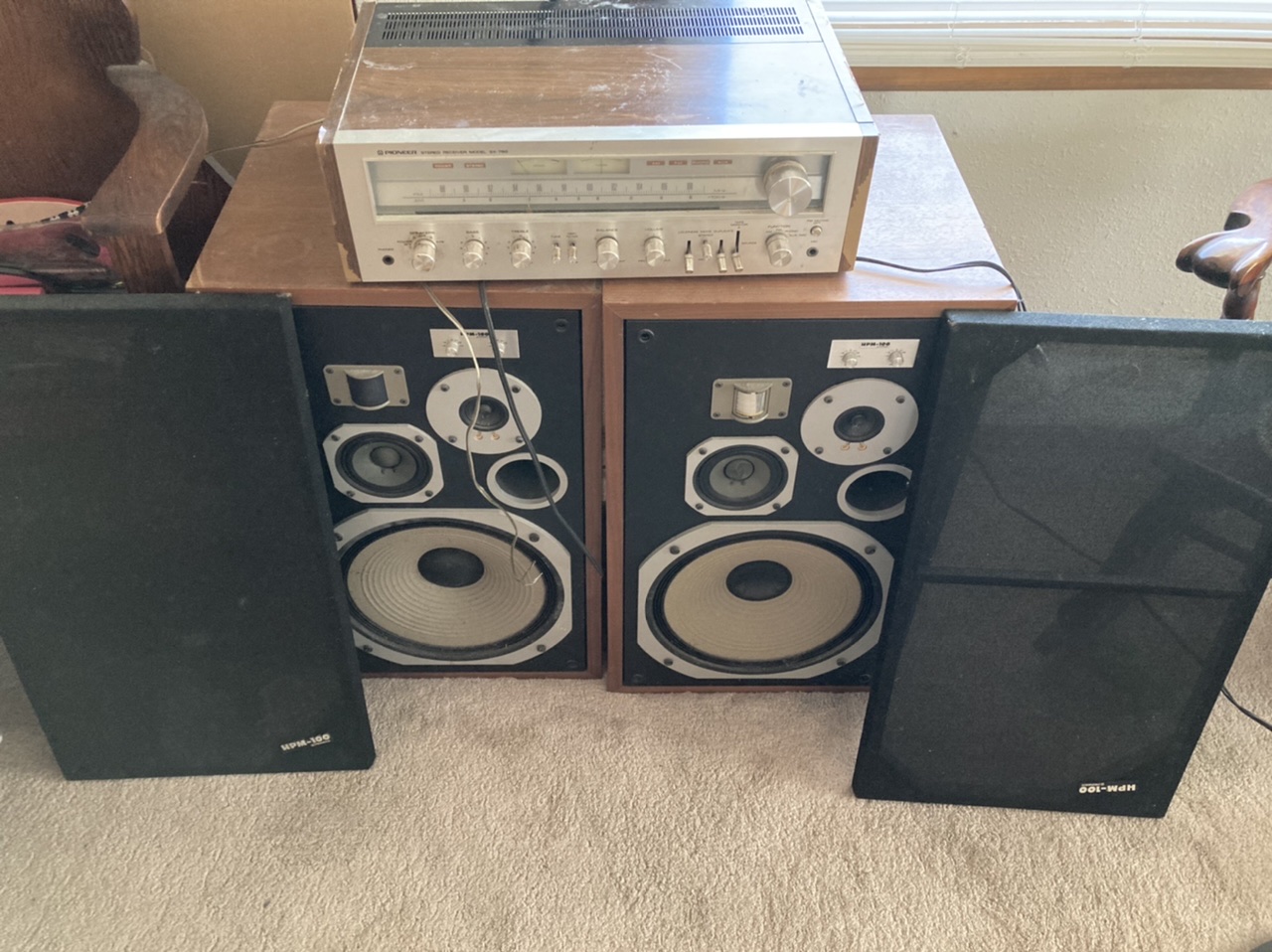 Are there any guys into Vintage Stereo systems and prices? I have this old Pioneer set that my dad gave me. I grew up using it and it kicked so much ass, but has not been used in a long time and has fallen into disrepair. Cosmetically it has some issues like peeling of the paint on corners, but nothing that couldn't be fixed up. I wiped off the top in the second pic and it looks way better even then. It powers up and gets sound, and the Right channel works. Both speakers work, but the left is cutting out. It does not seem like a speaker issue, but more just a pot issue. There are some obvious cosmetic issues also, but overall it's in decent condition for someone who likes to refurb these. How much would you say I should ask for it as a fair price?