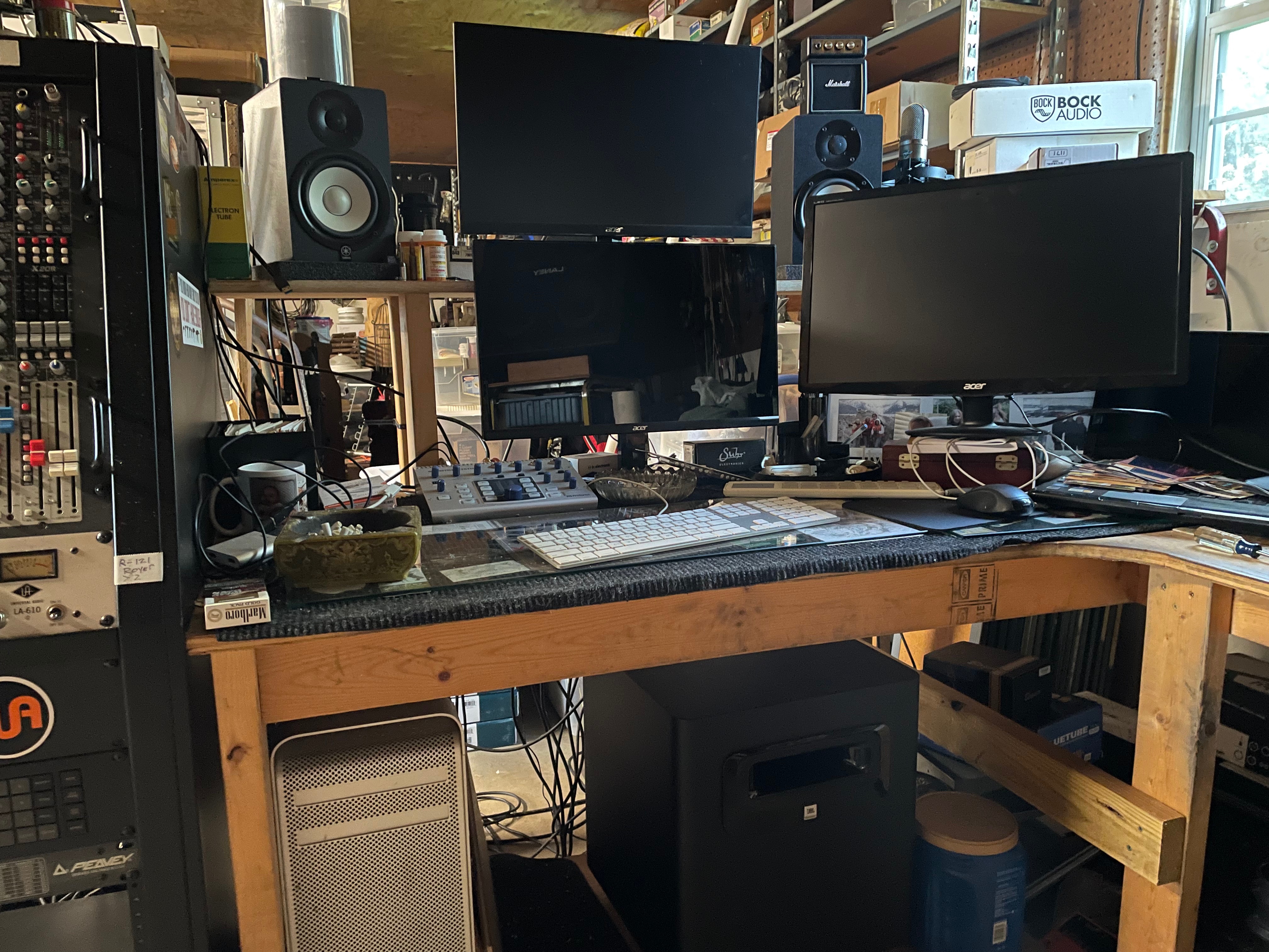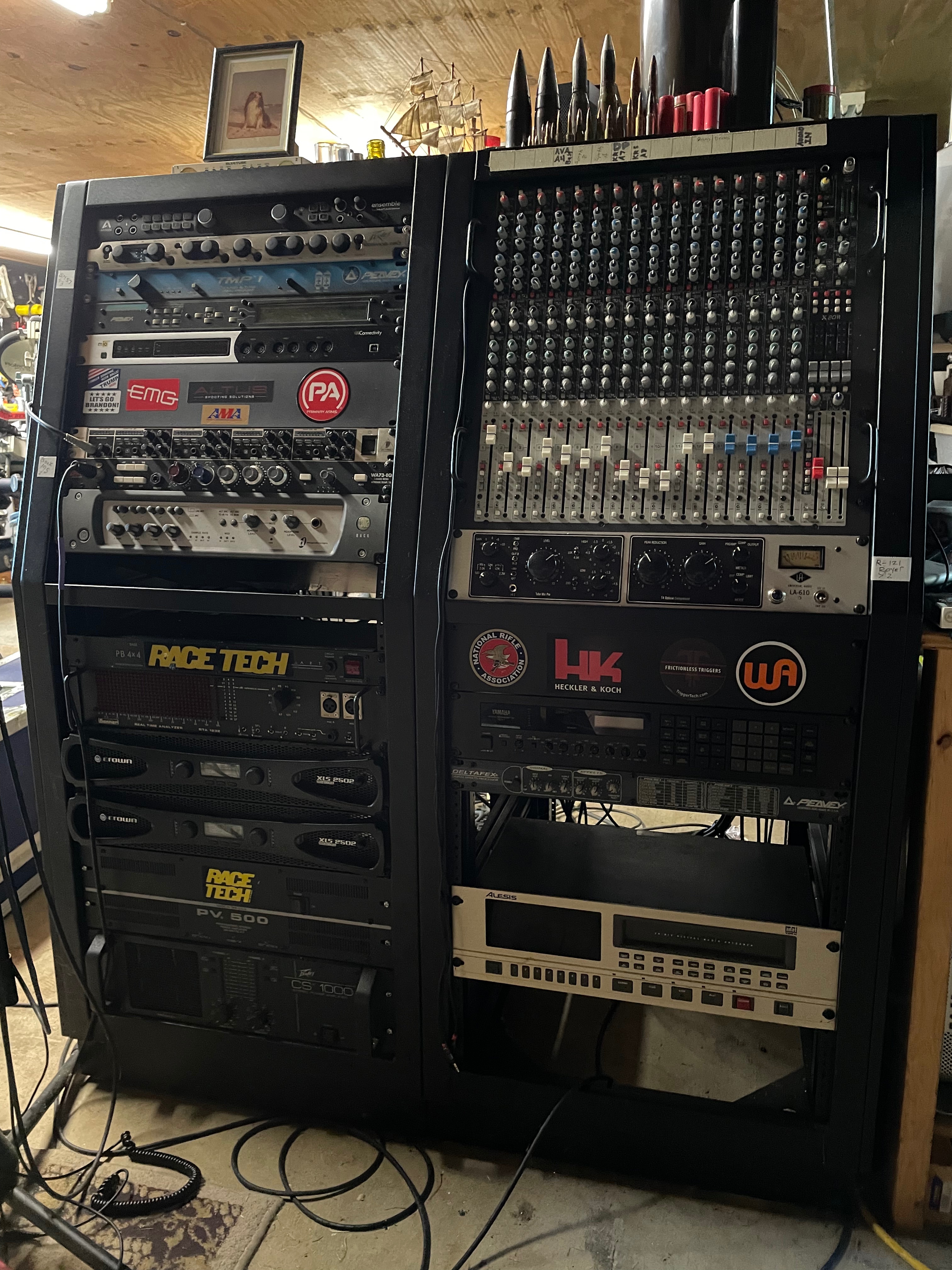 We are running Logic Pro with a Mac Pro (the Darth Vader looking one) with an Apogee Ensemble interface, UA LA610 and Warm WA73 EQ and a PV TMP1 preamps in addition to the Apogee preamps. A Crest Audio outboard mixing board that also has some nice pre’s in it. Drums are done on a Roland V drum set that runs Superior Drummer 3 with a iconnectivity Mio 10 midi hub/merger due to the Apogee not having midi inputs. So we are playing the drums using the SD3 sounds direct with live miced up cymbals (my drummer hates the feel of the V drum cymbal pads) while hearing them through the live system which is the Crest Audio board into 2 Crown XLS 2502’s, 1 running 2 EAW FR253HR’s hi-passed at 80hz and another 2502 running bridged into a JBL SRX 215 sub lo-passed at around 70-80 hz that will move the hair on your arms.