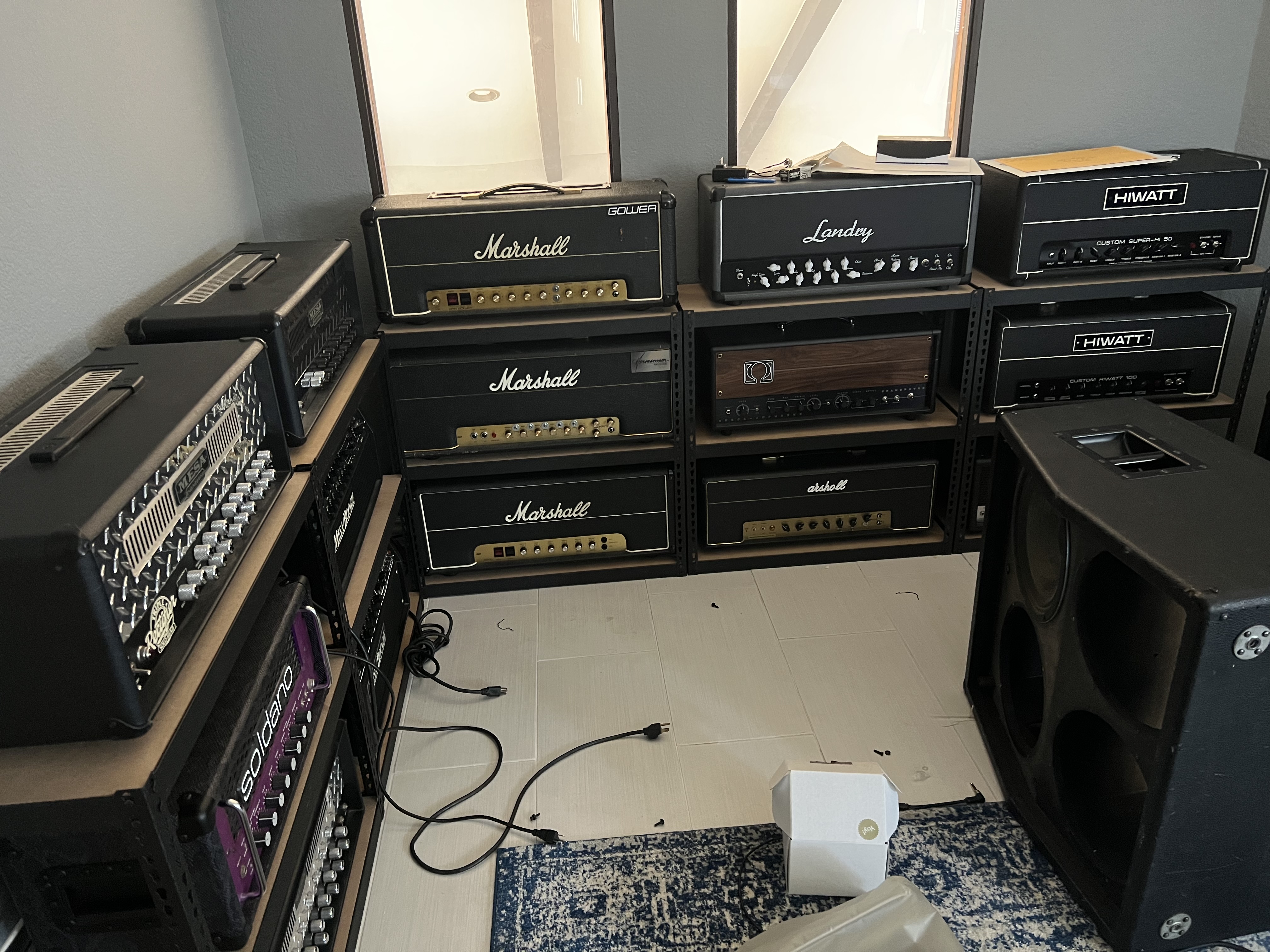 I am planning to build some custom shelving for all my amps in the near future. I'm going to use black structural pipe and hardwood shelves. There's a bunch of different types of brackets for everything so I'll be able to make it the exact width and height I want. I'll also be able to set the shelves just right. I'll be able to optimize the space I have with nothing wasted.
