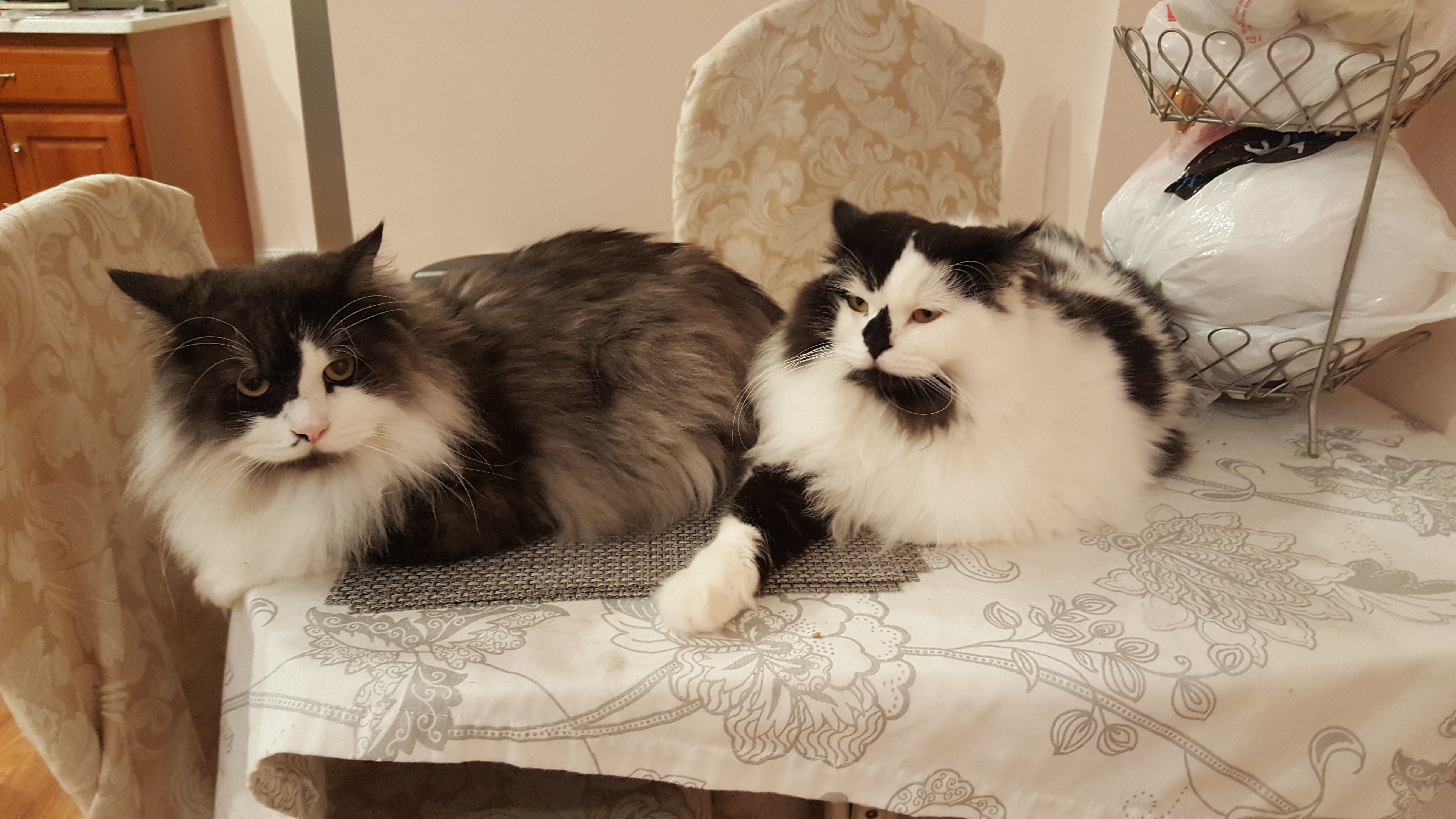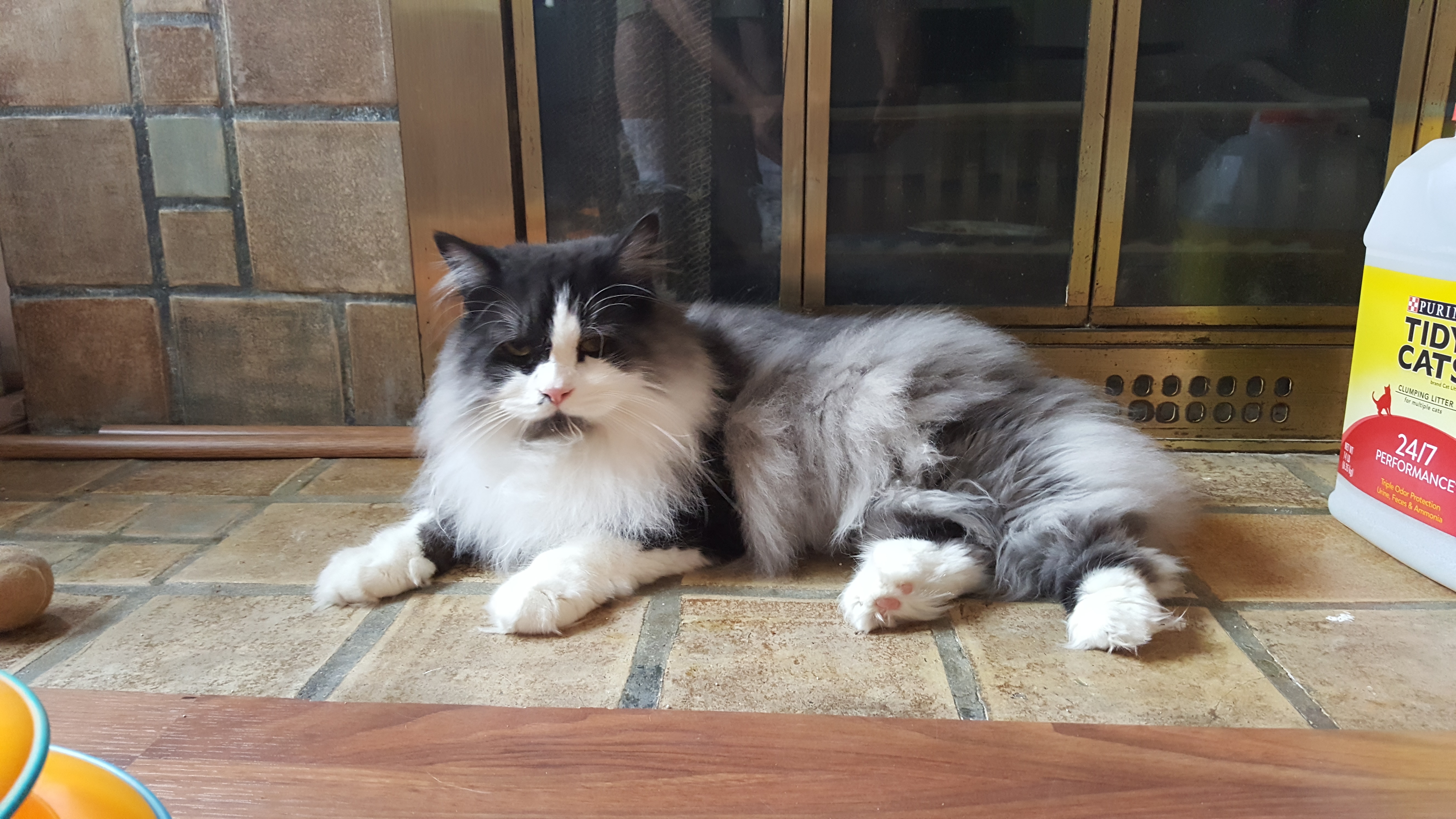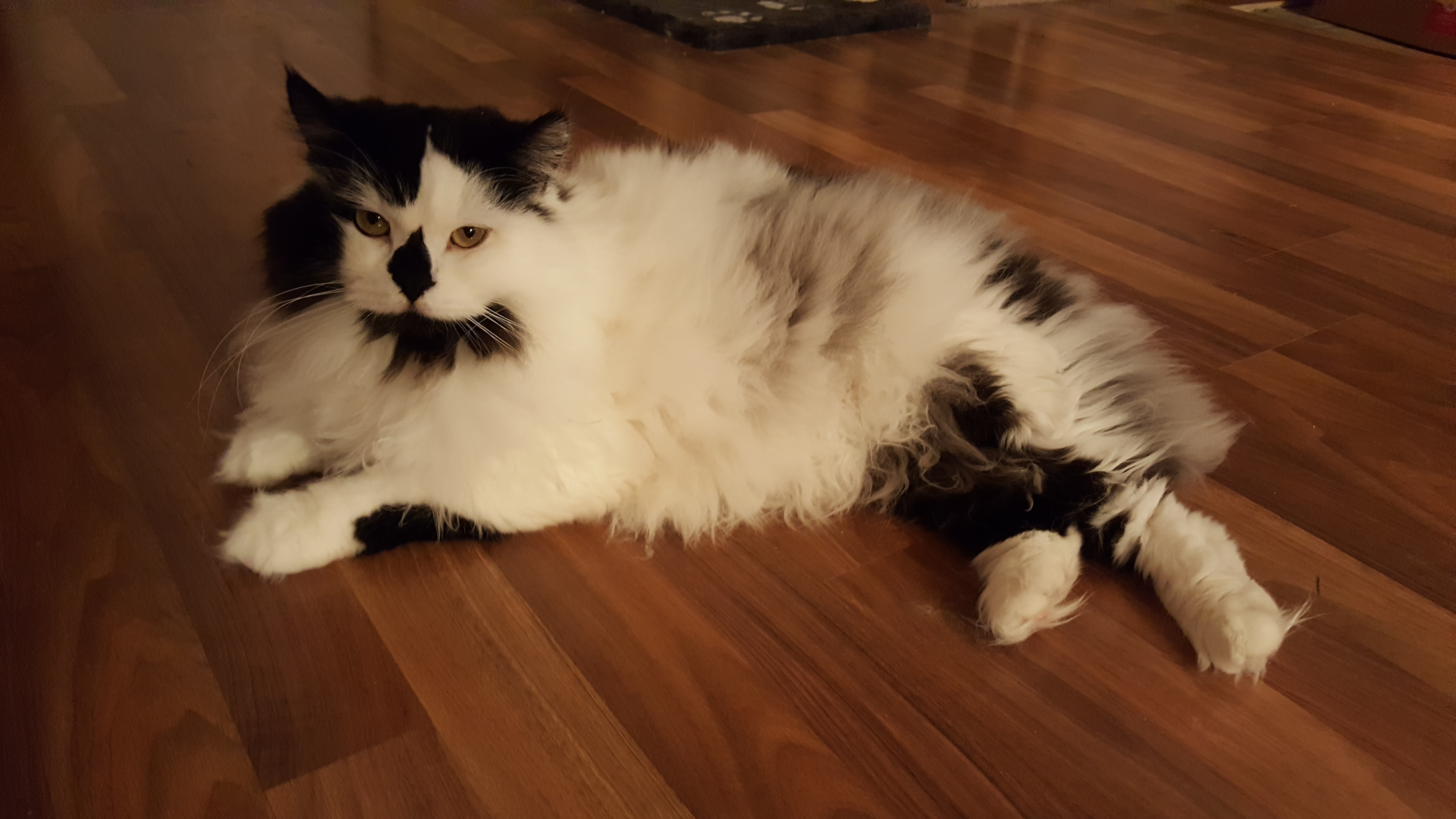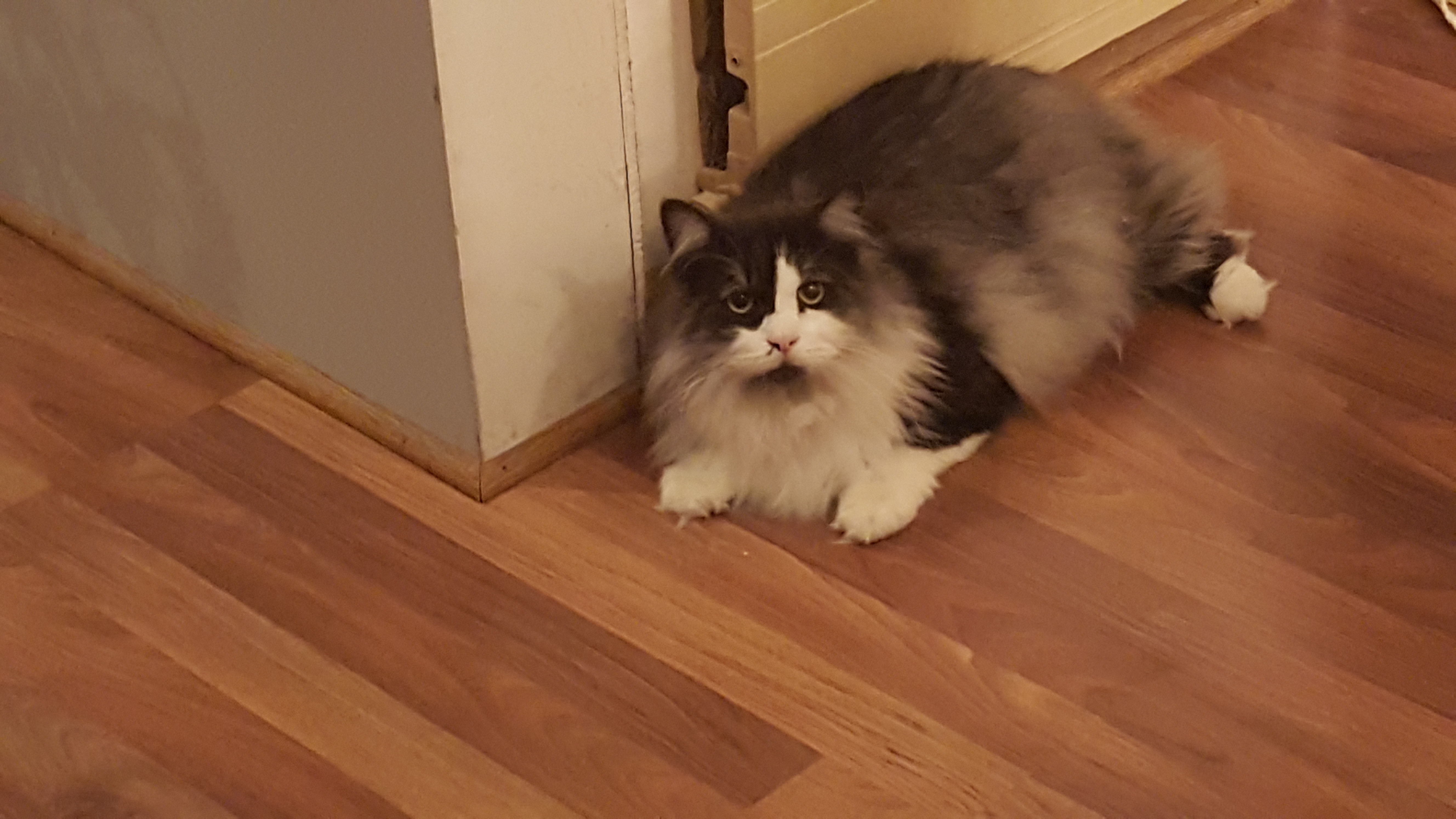 1) Dolyn (Doll-lynn) is the king of the pride. Hes White and Black, fluffy. He weighs 9 1/2 pounds. Hes very outgoing, friendly, playful and smart as can be.
