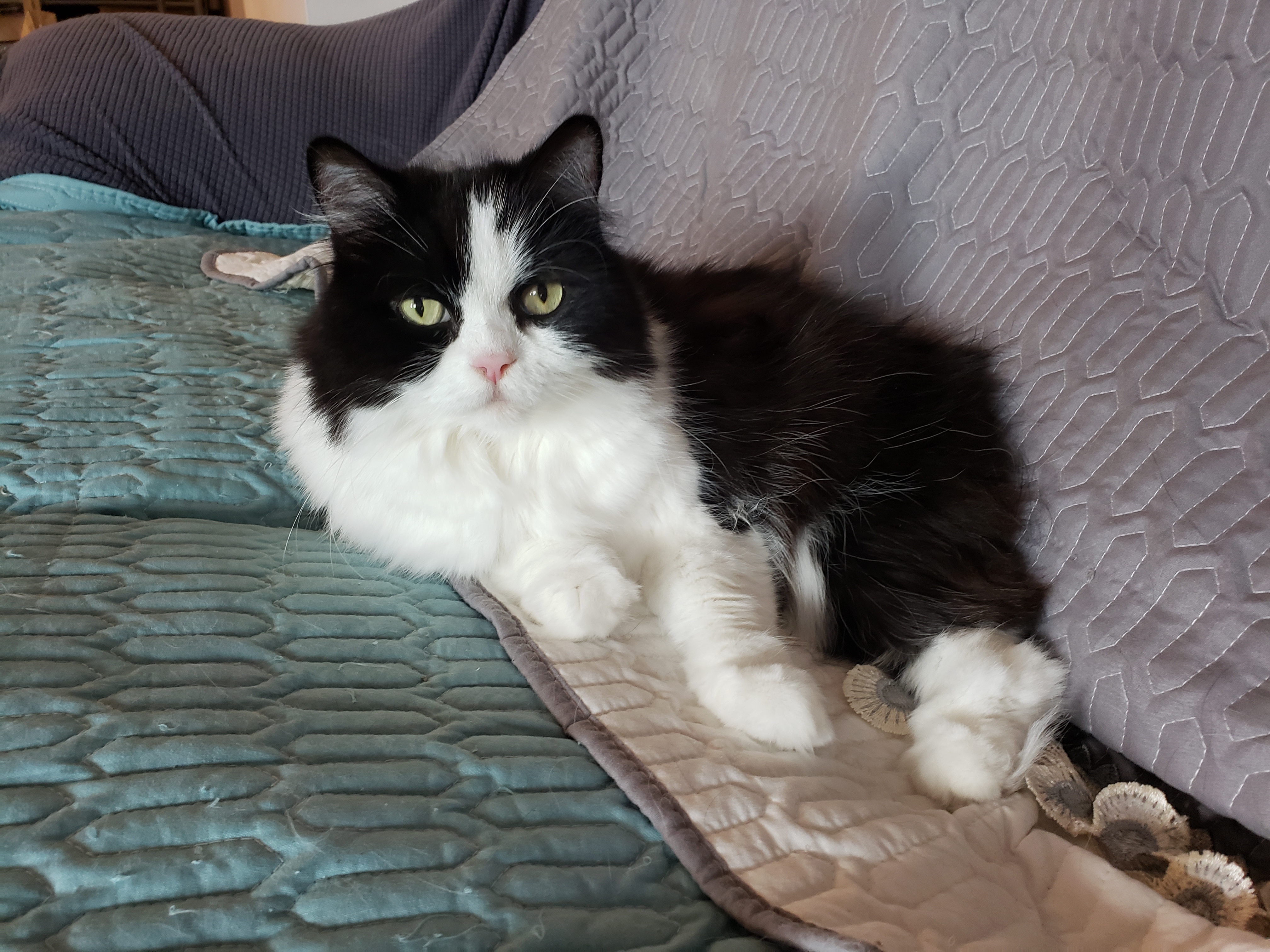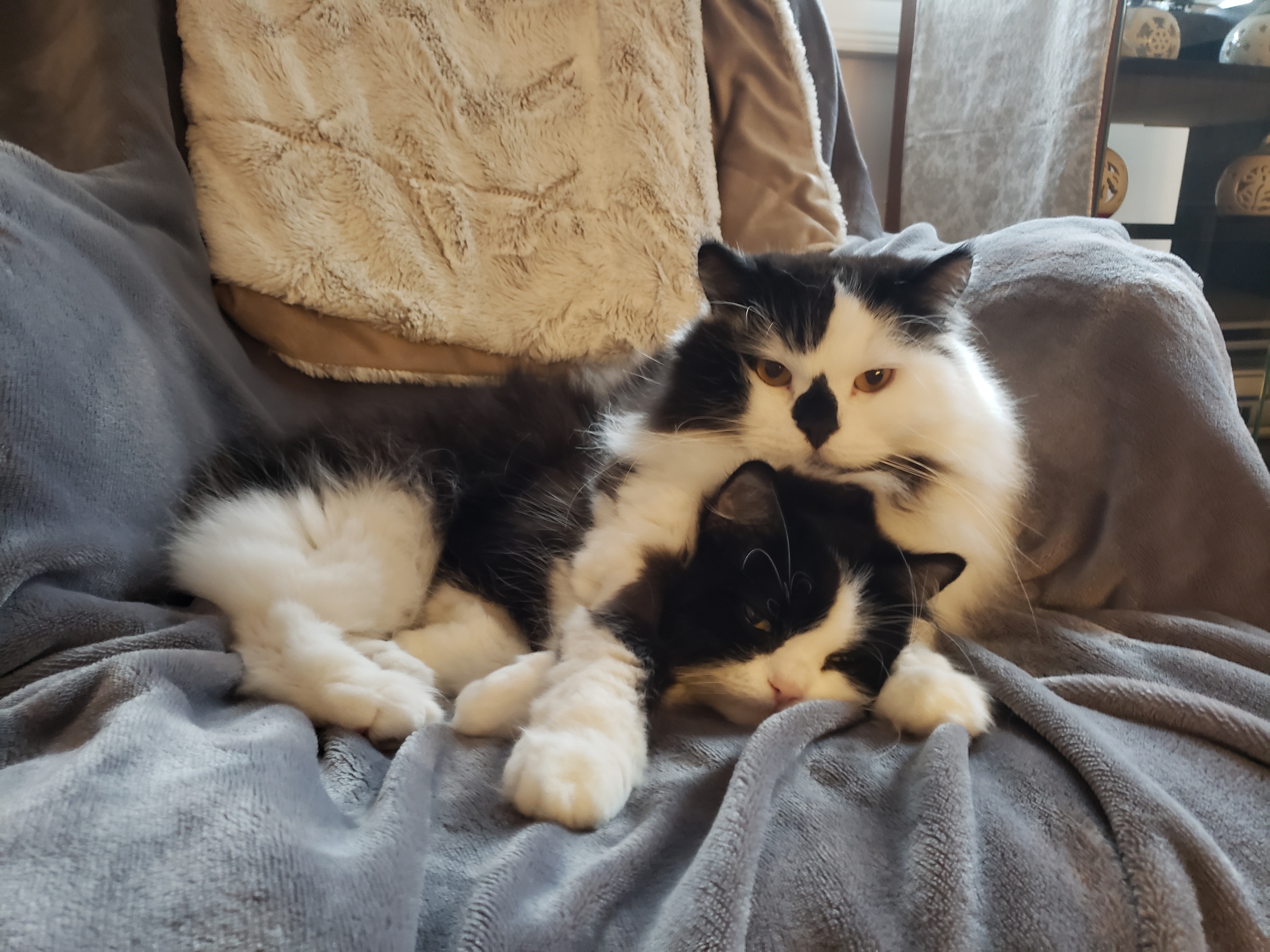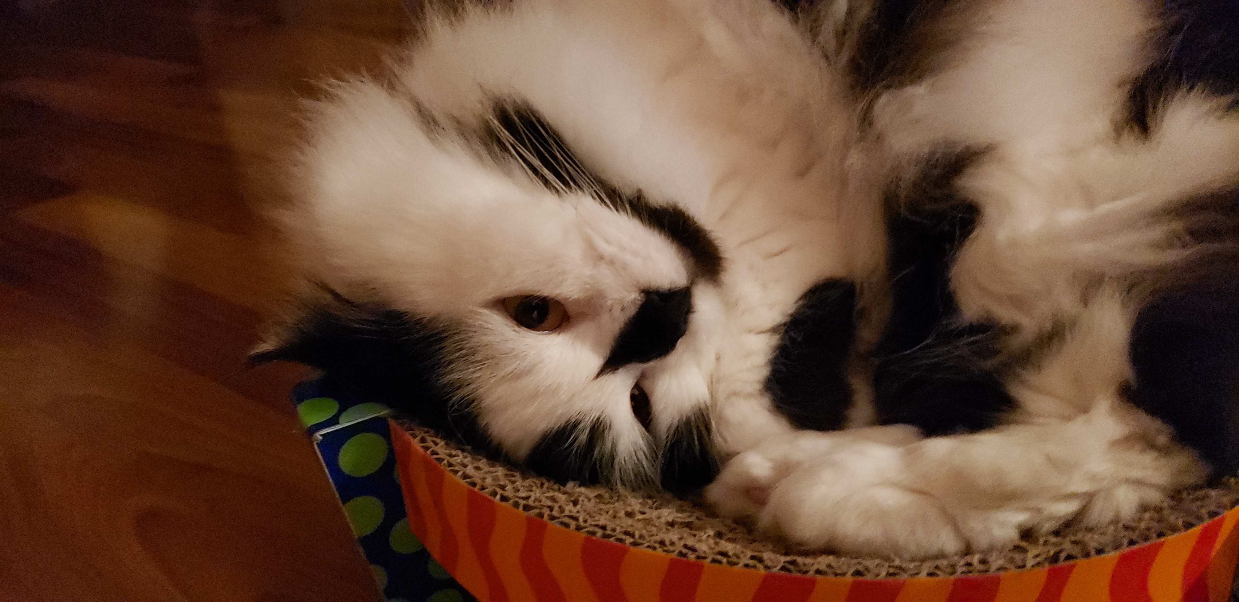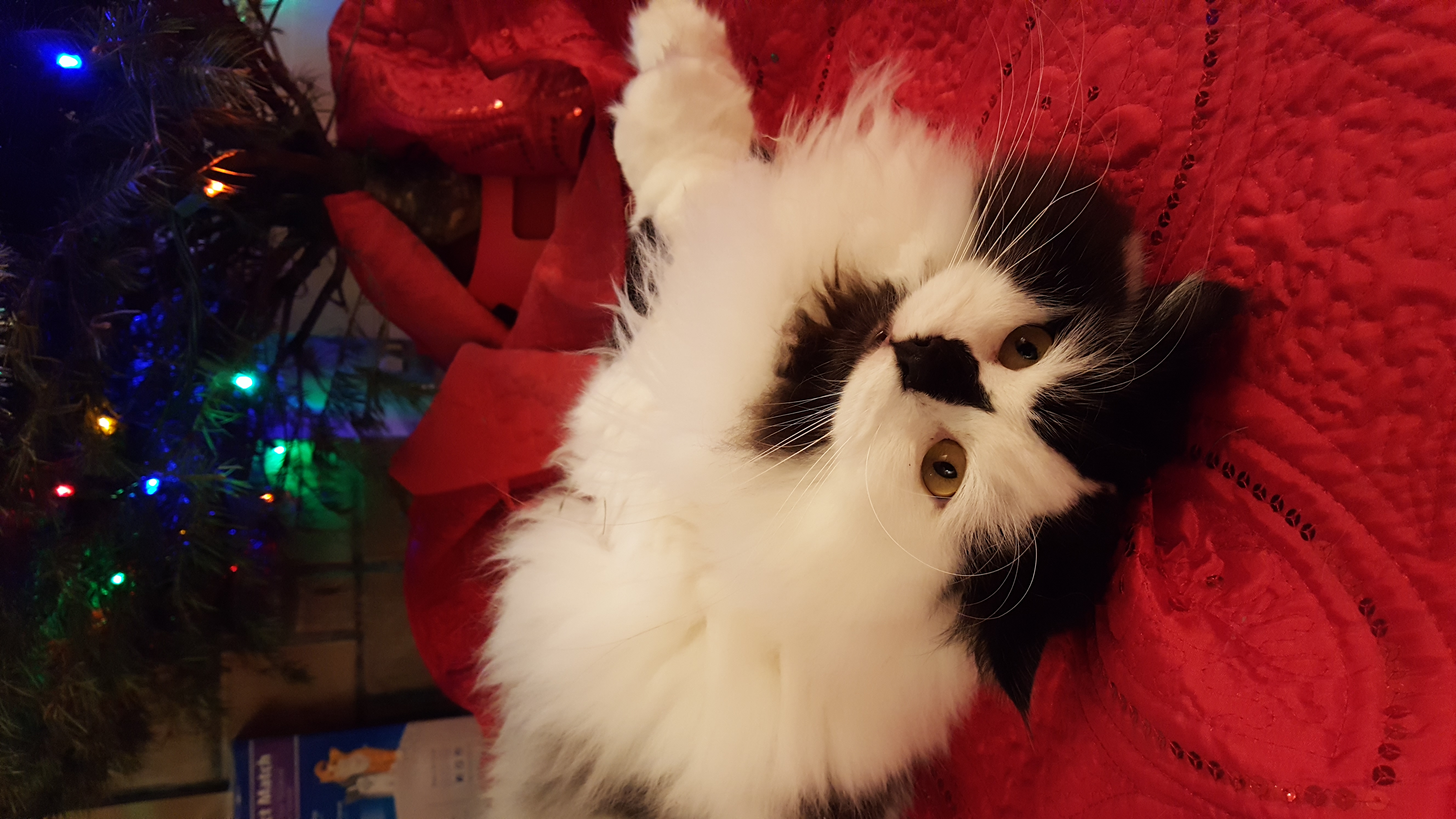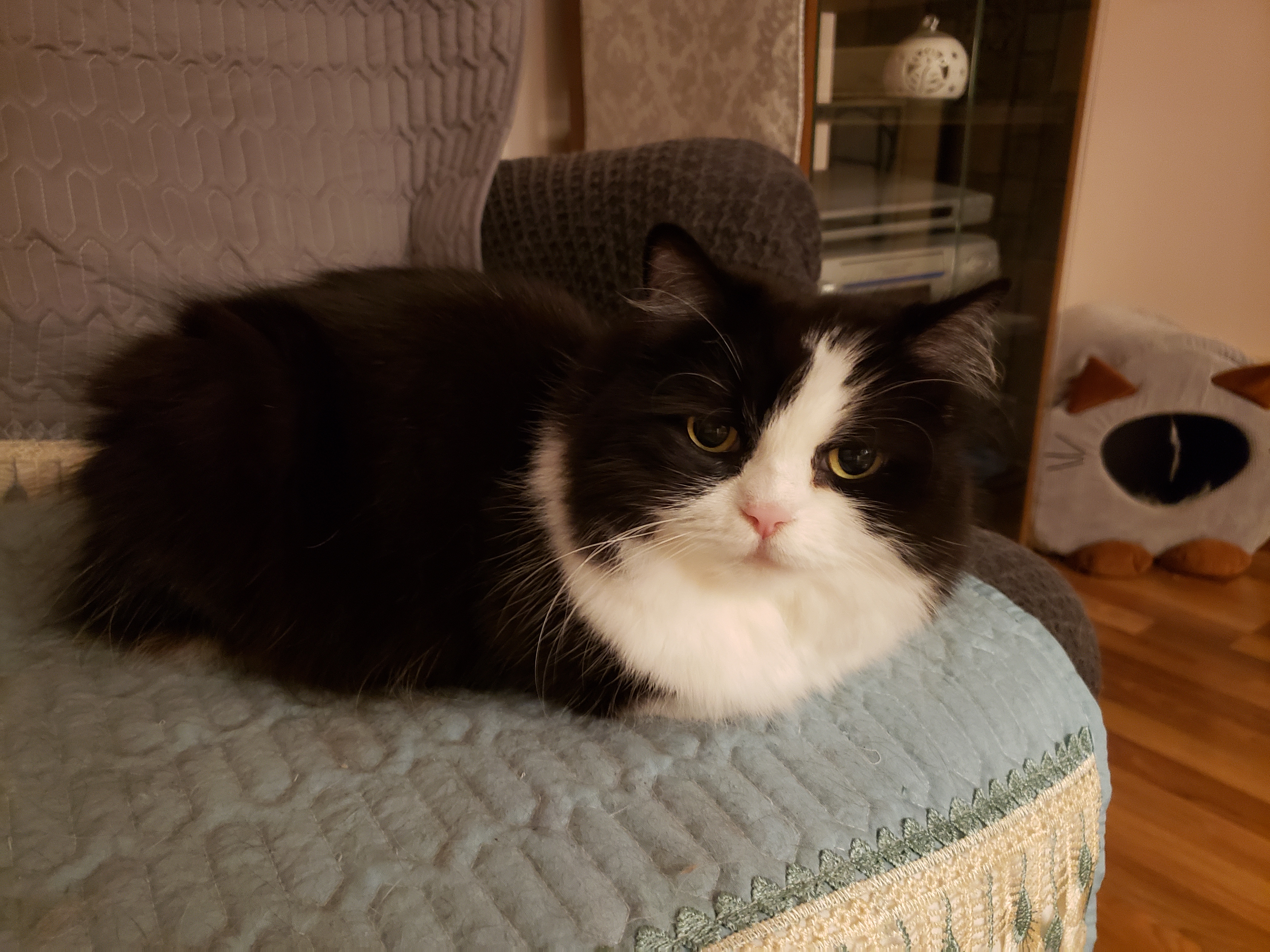1) Dolyn (Doll-lynn) is the king of the pride. Hes White and Black, fluffy. He weighs 9 1/2 pounds. Hes very outgoing, friendly, playful and smart as can be.