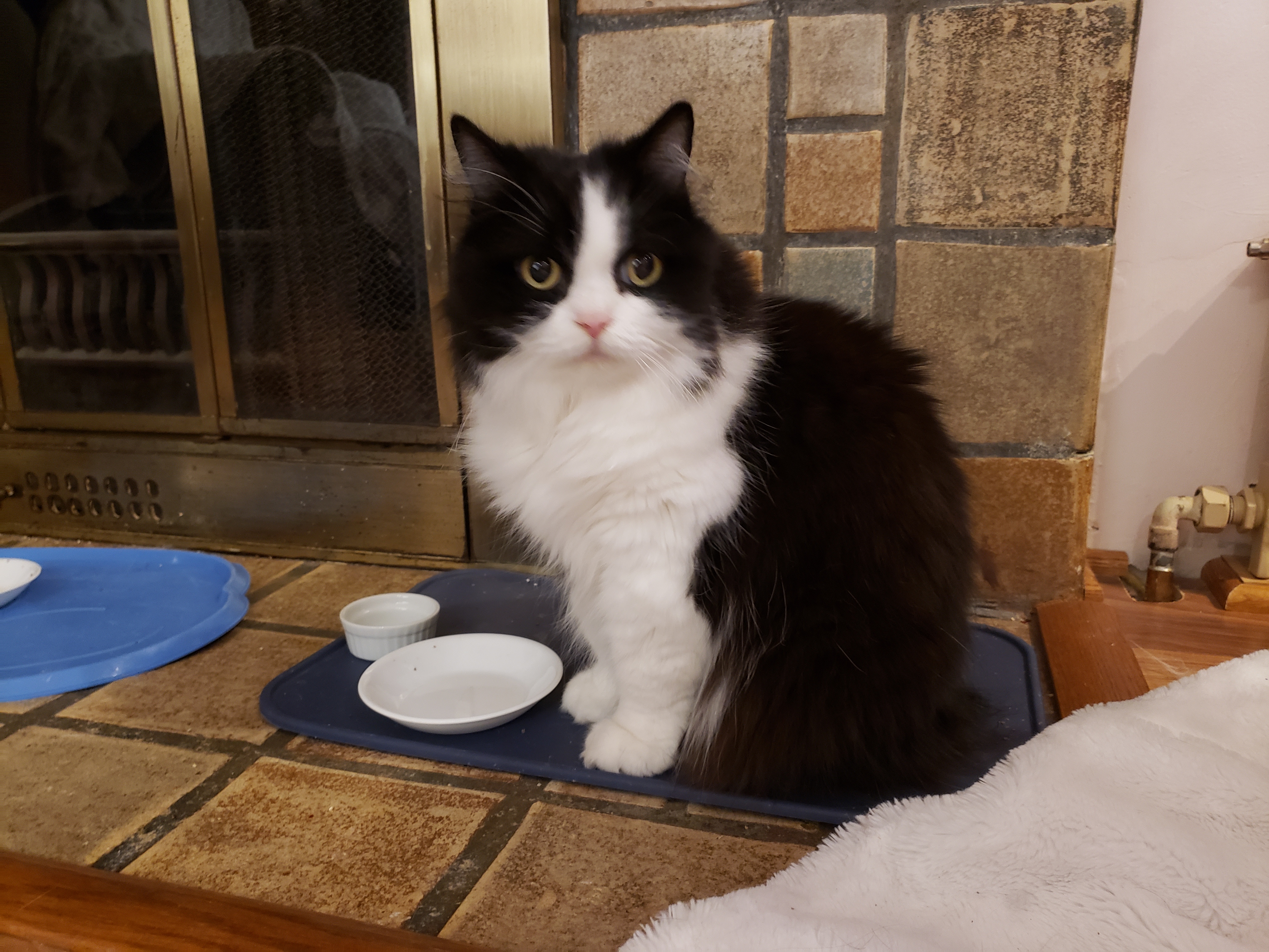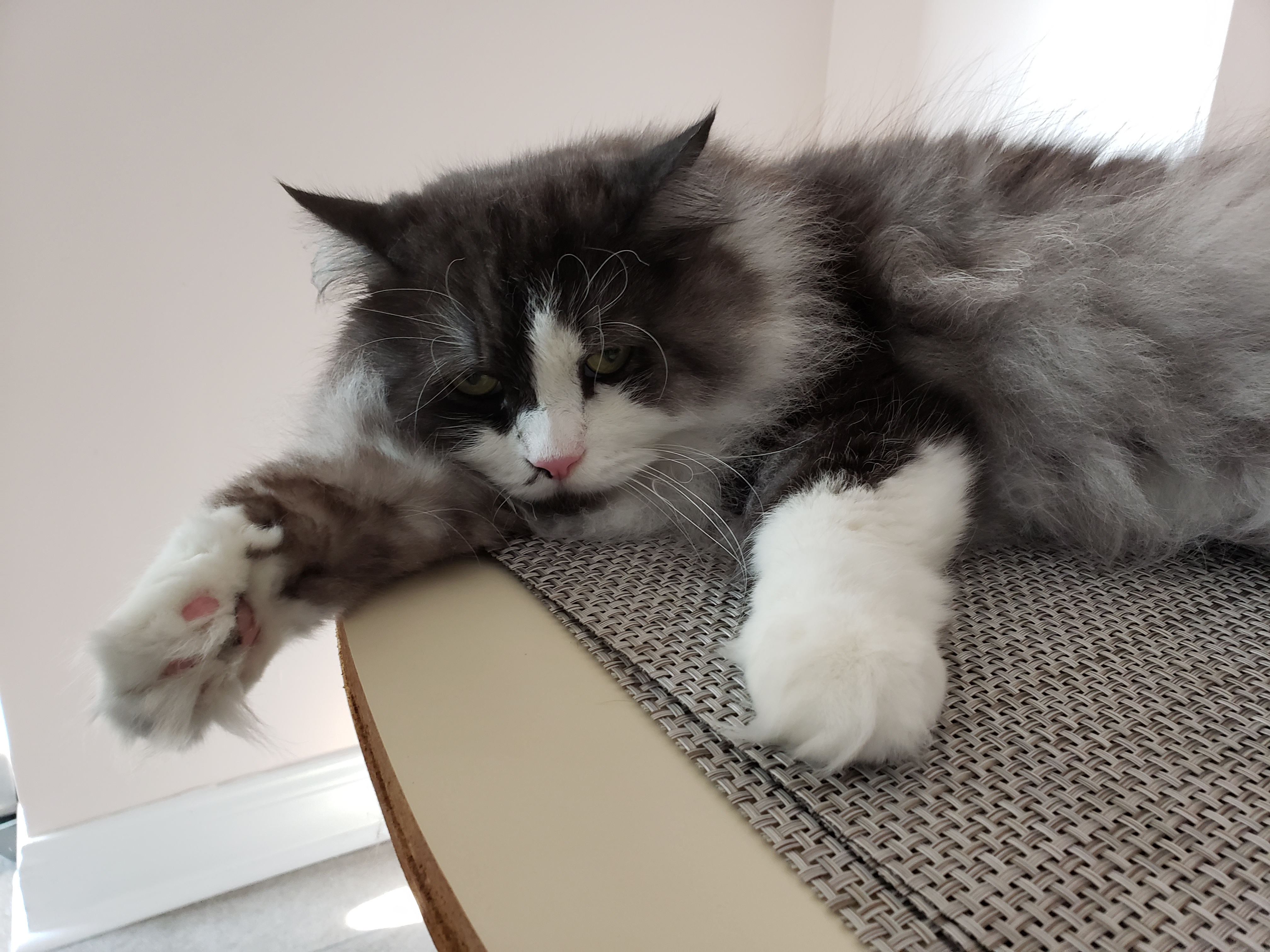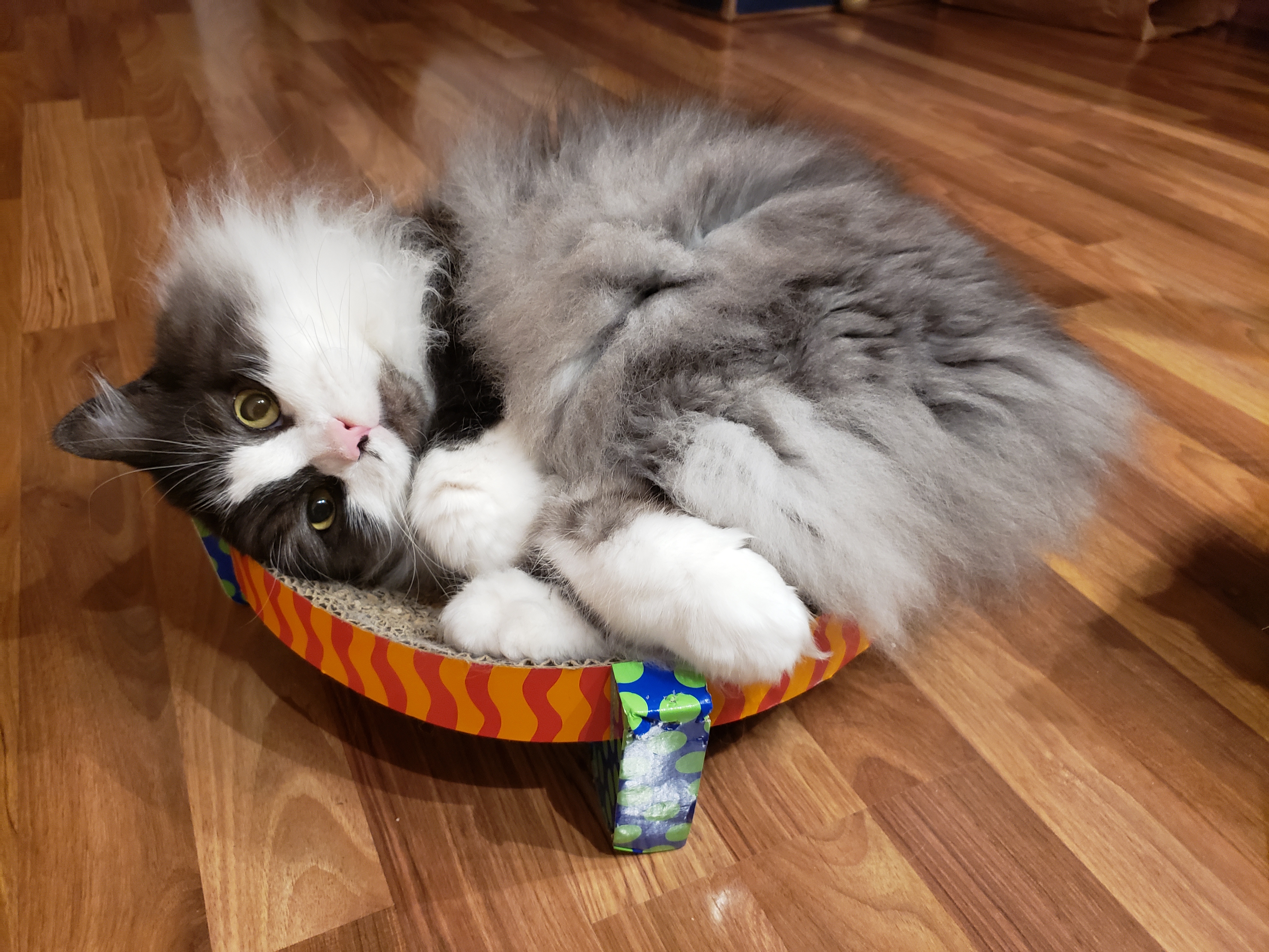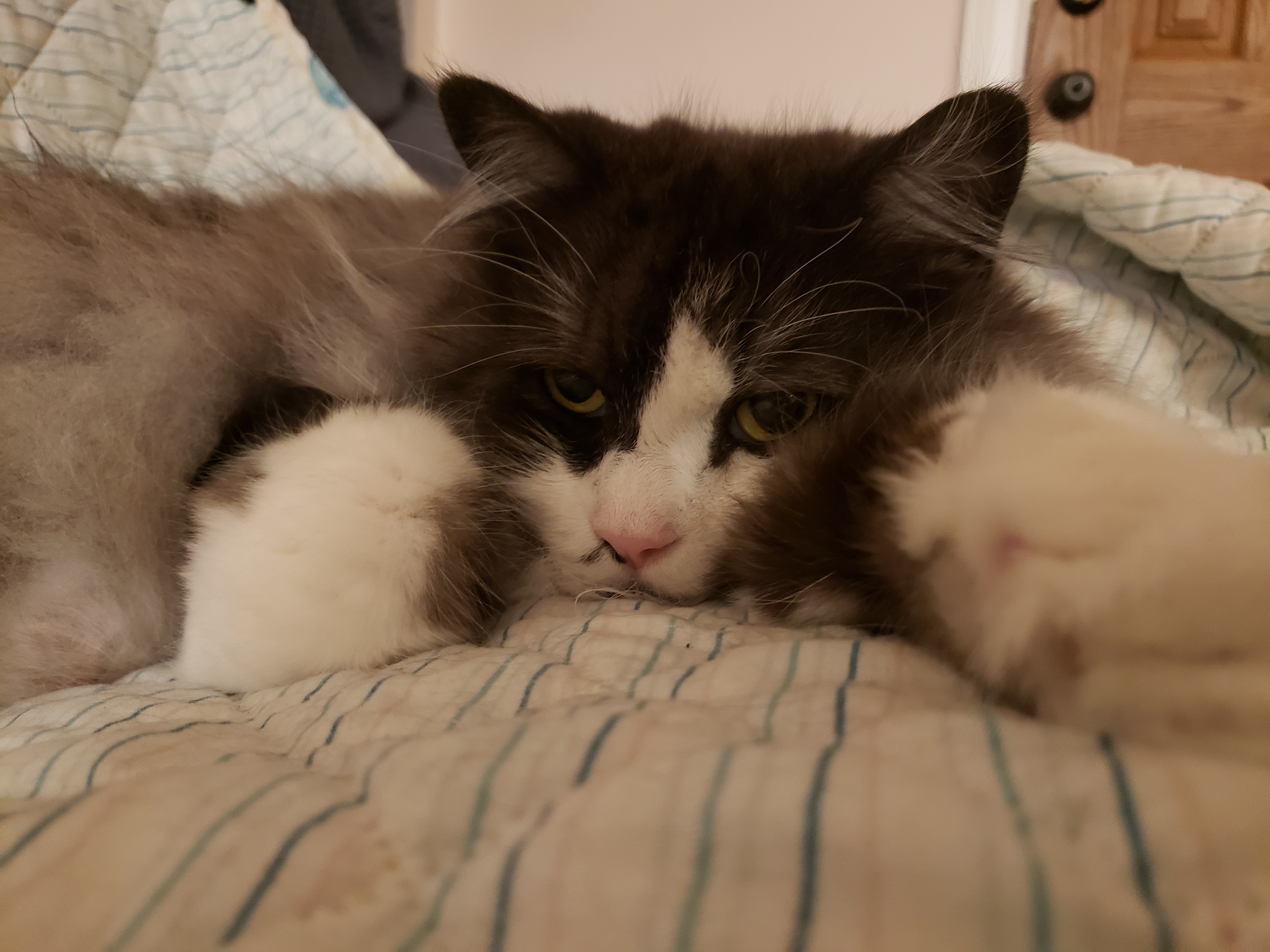 1) Dolyn (Doll-lynn) is the king of the pride. Hes White and Black, fluffy. He weighs 9 1/2 pounds. Hes very outgoing, friendly, playful and smart as can be.