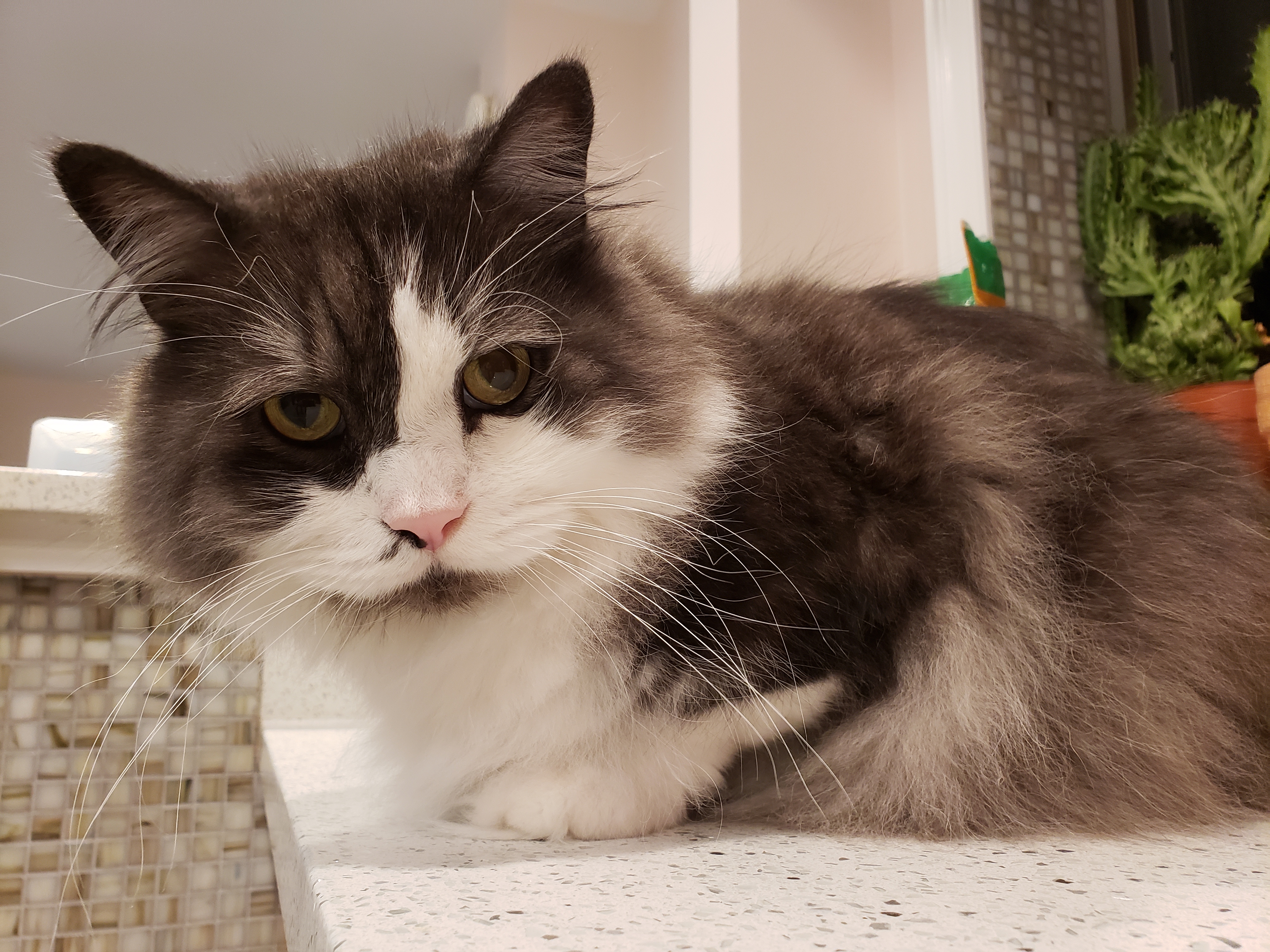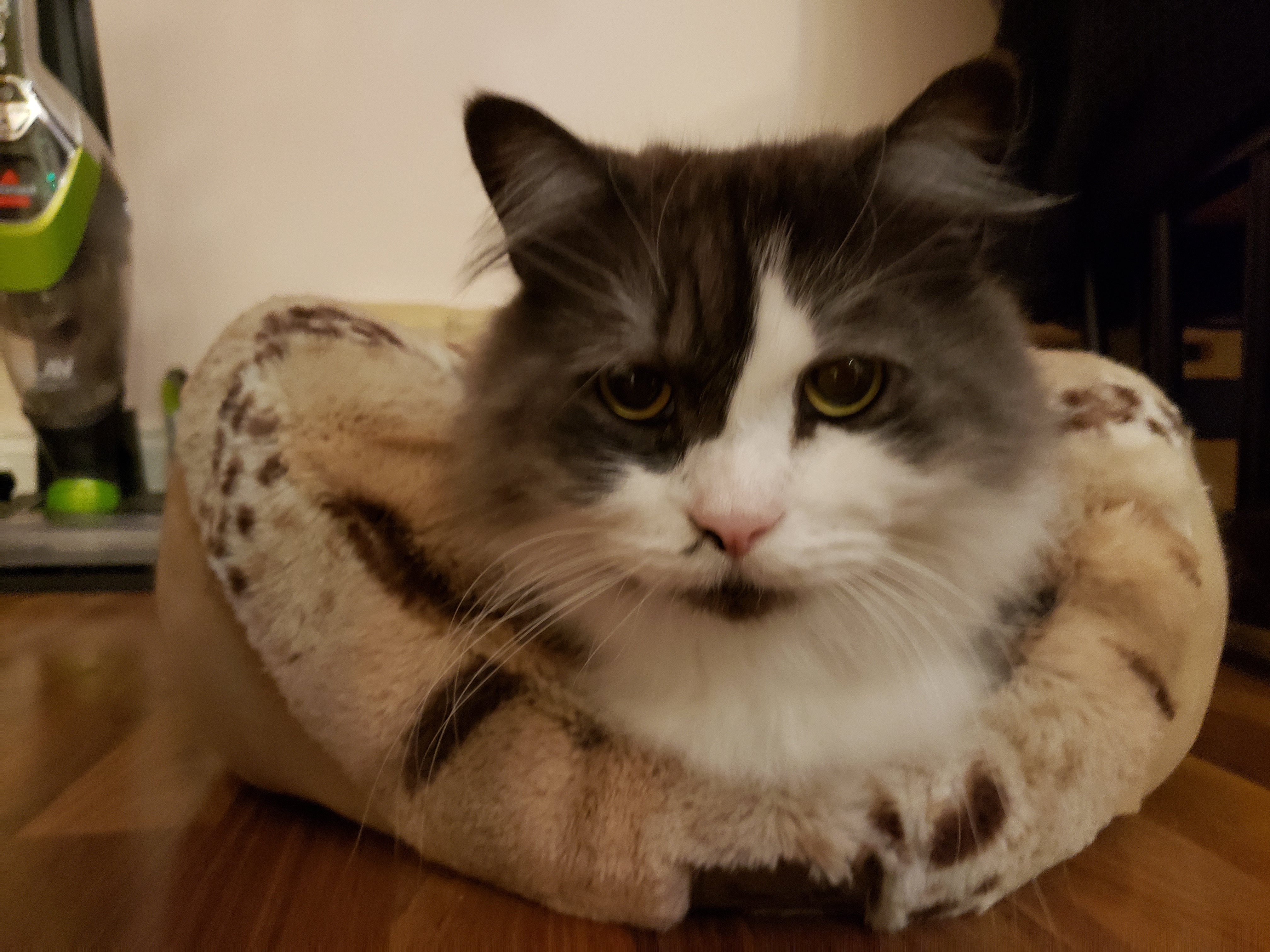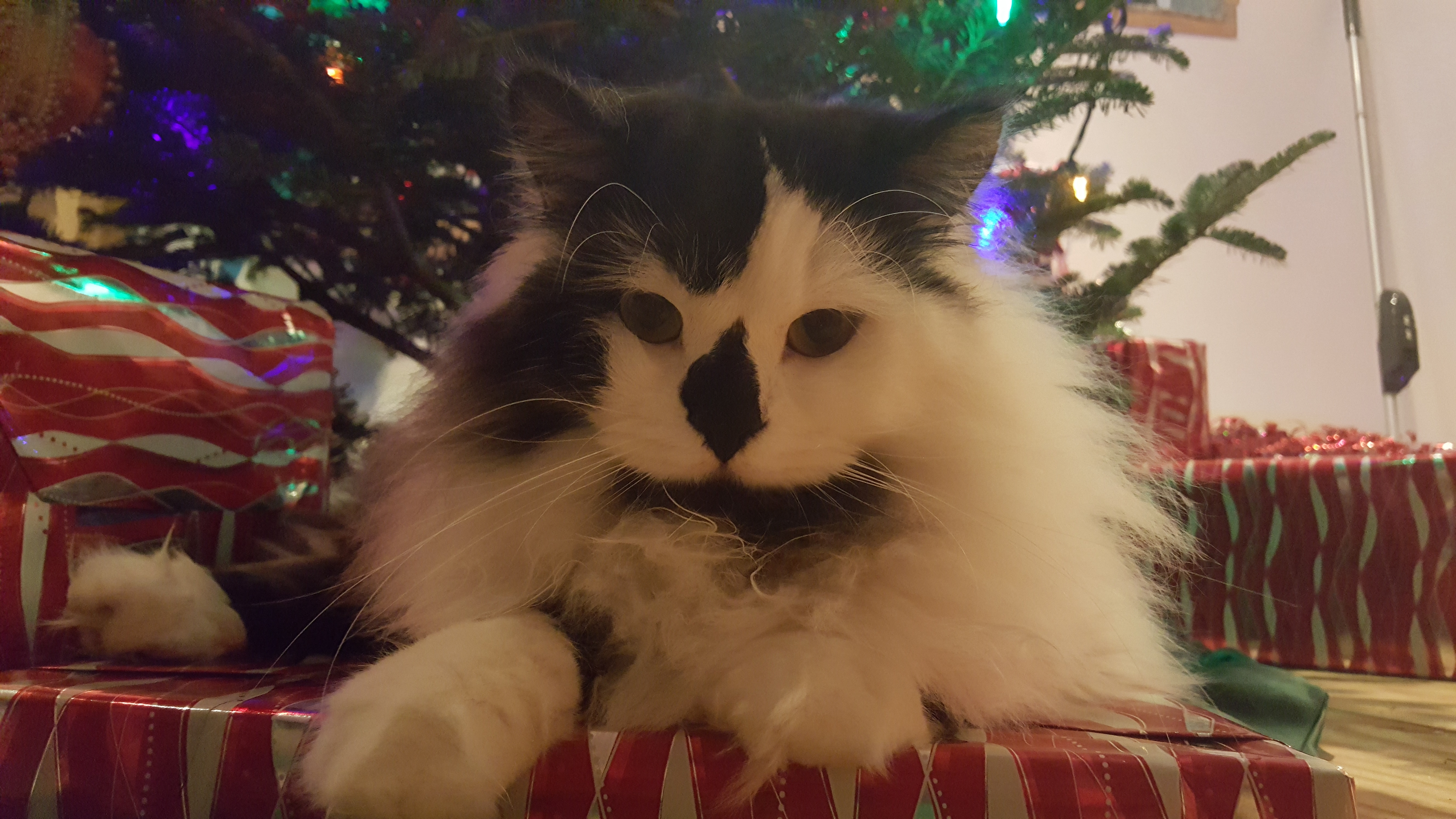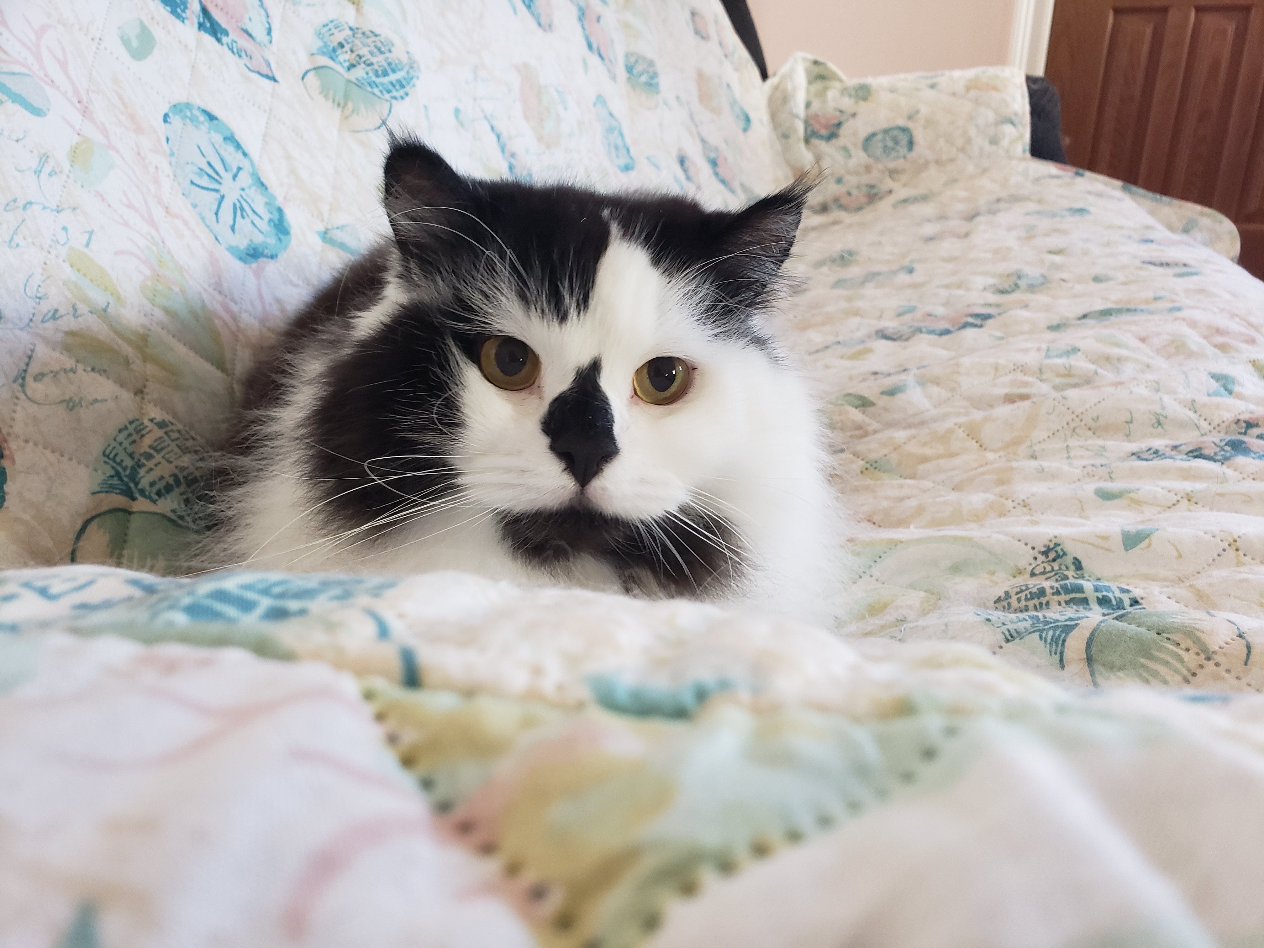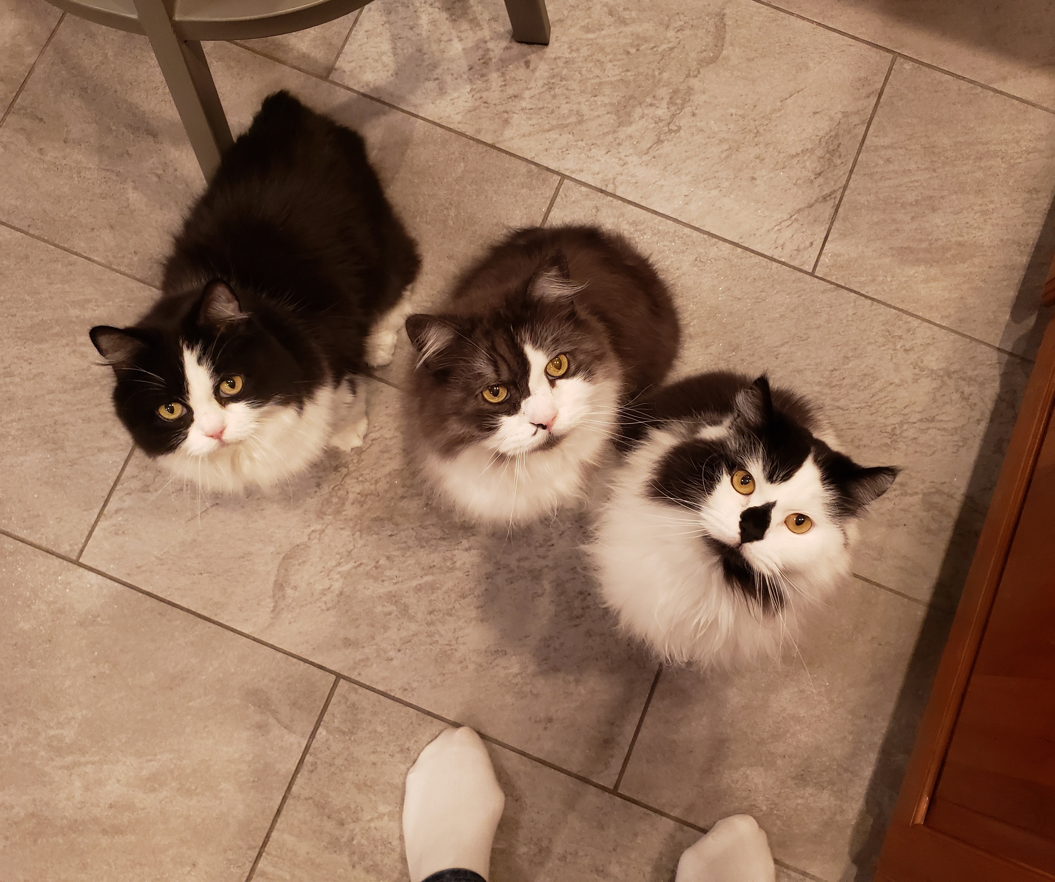 1) Dolyn (Doll-lynn) is the king of the pride. Hes White and Black, fluffy. He weighs 9 1/2 pounds. Hes very outgoing, friendly, playful and smart as can be.