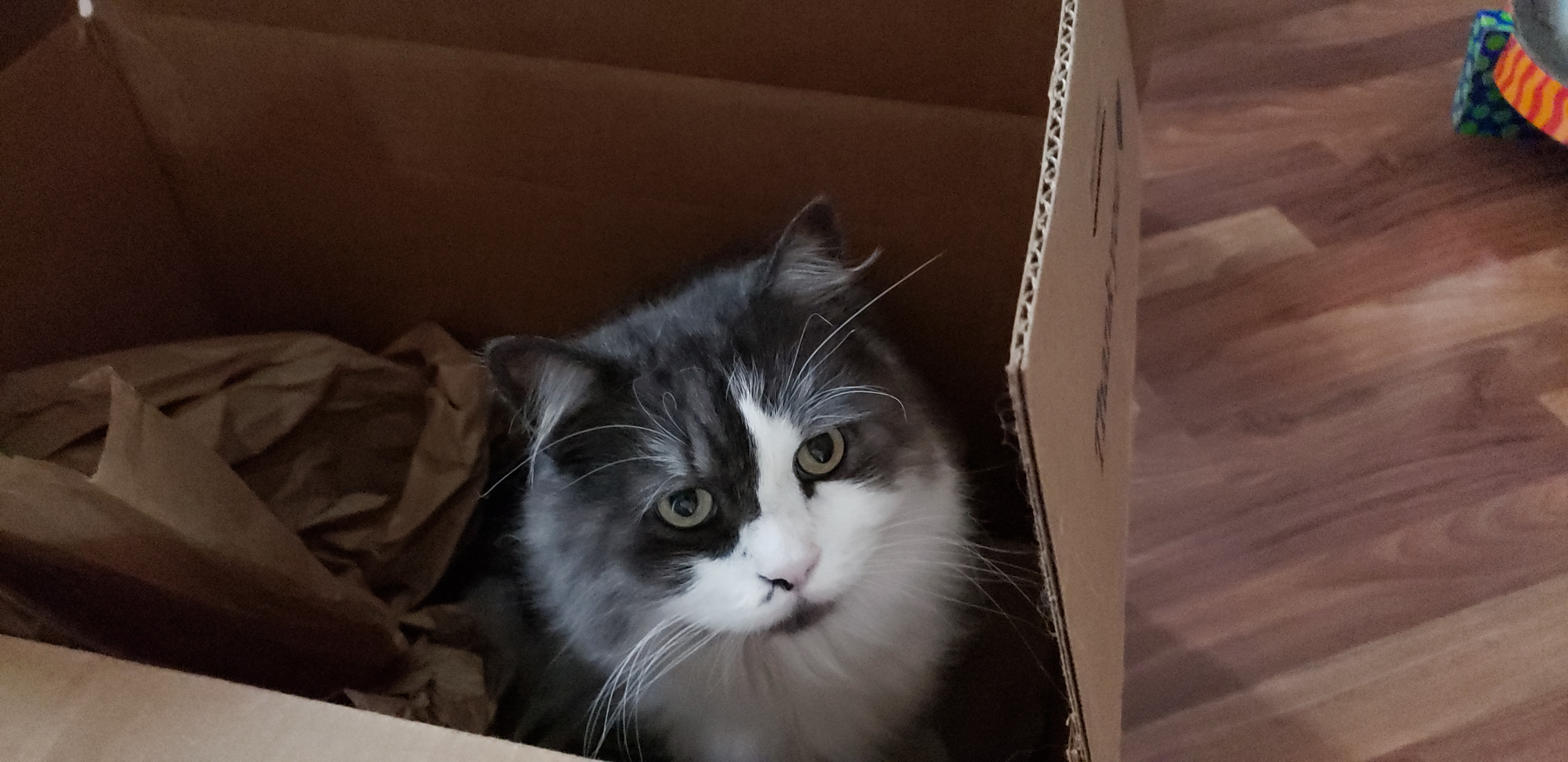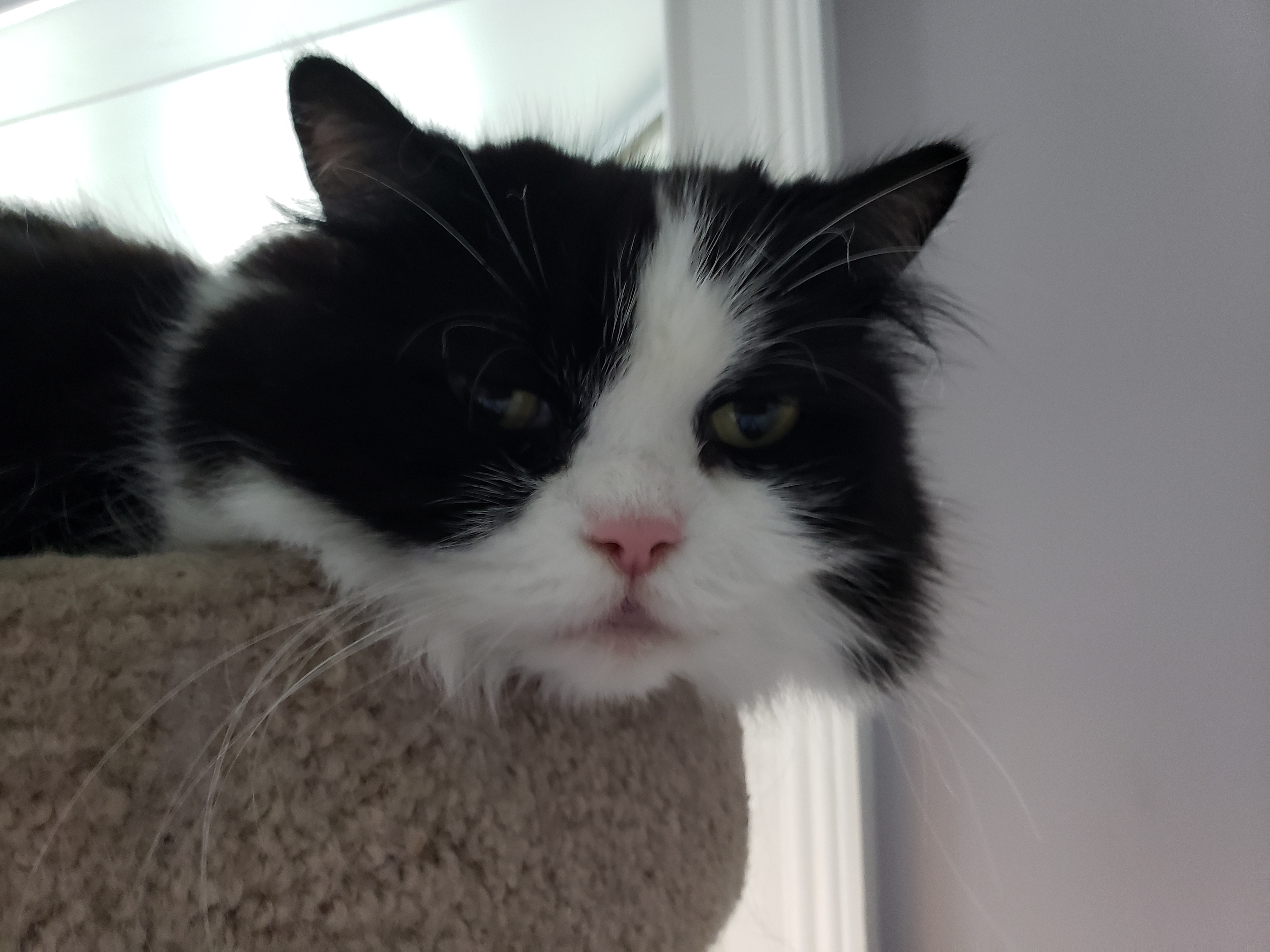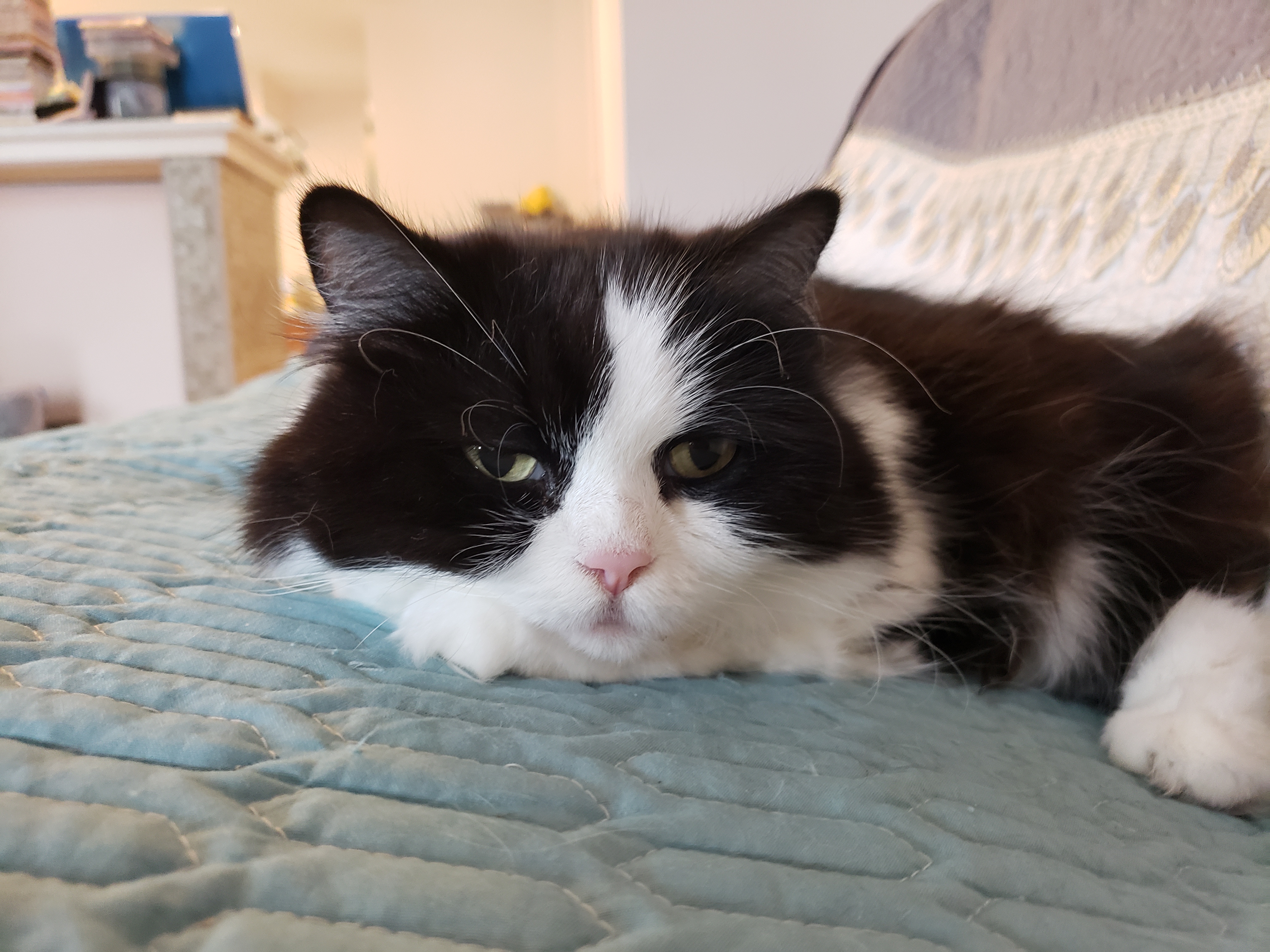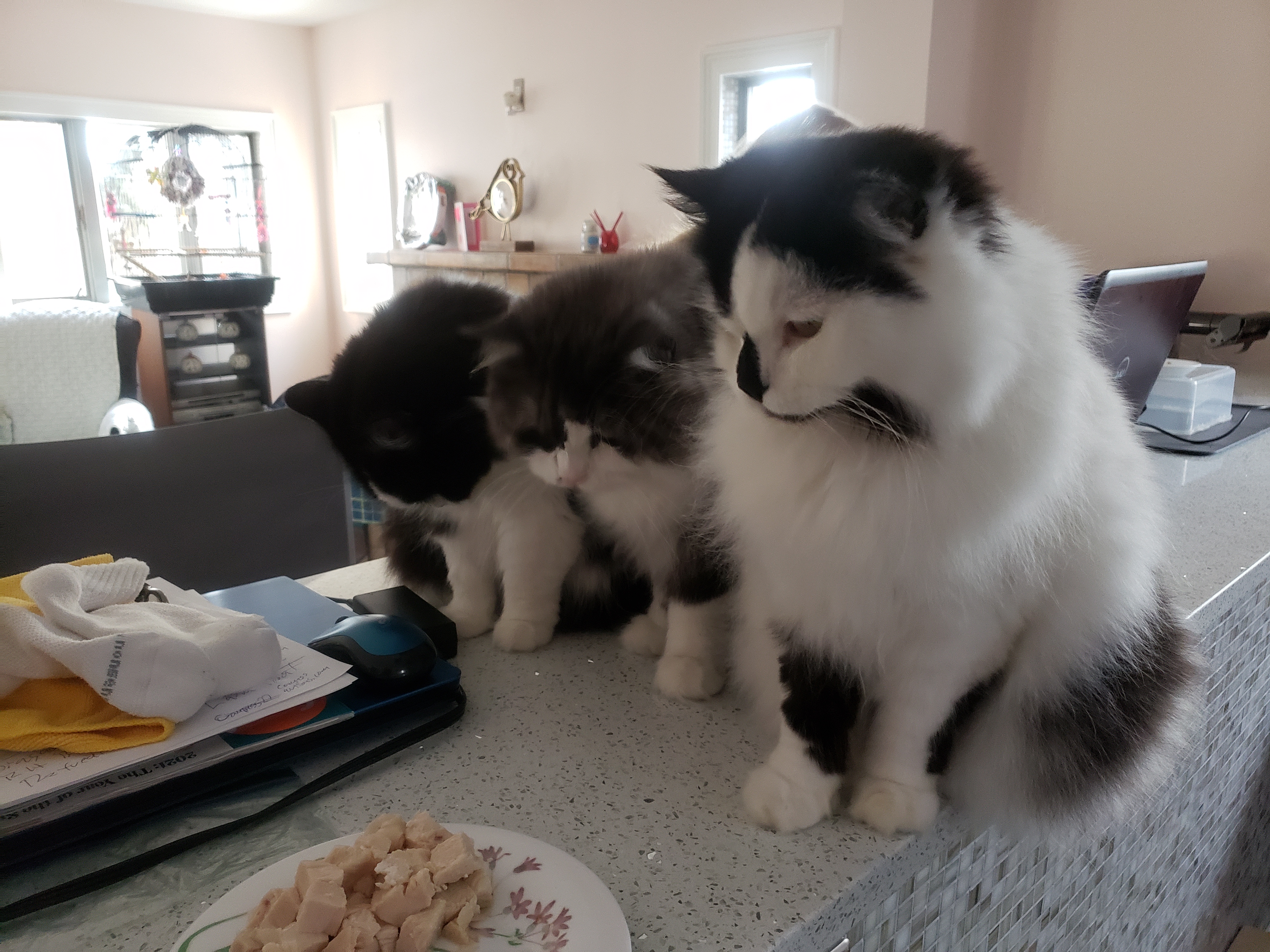 1) Dolyn (Doll-lynn) is the king of the pride. Hes White and Black, fluffy. He weighs 9 1/2 pounds. Hes very outgoing, friendly, playful and smart as can be.