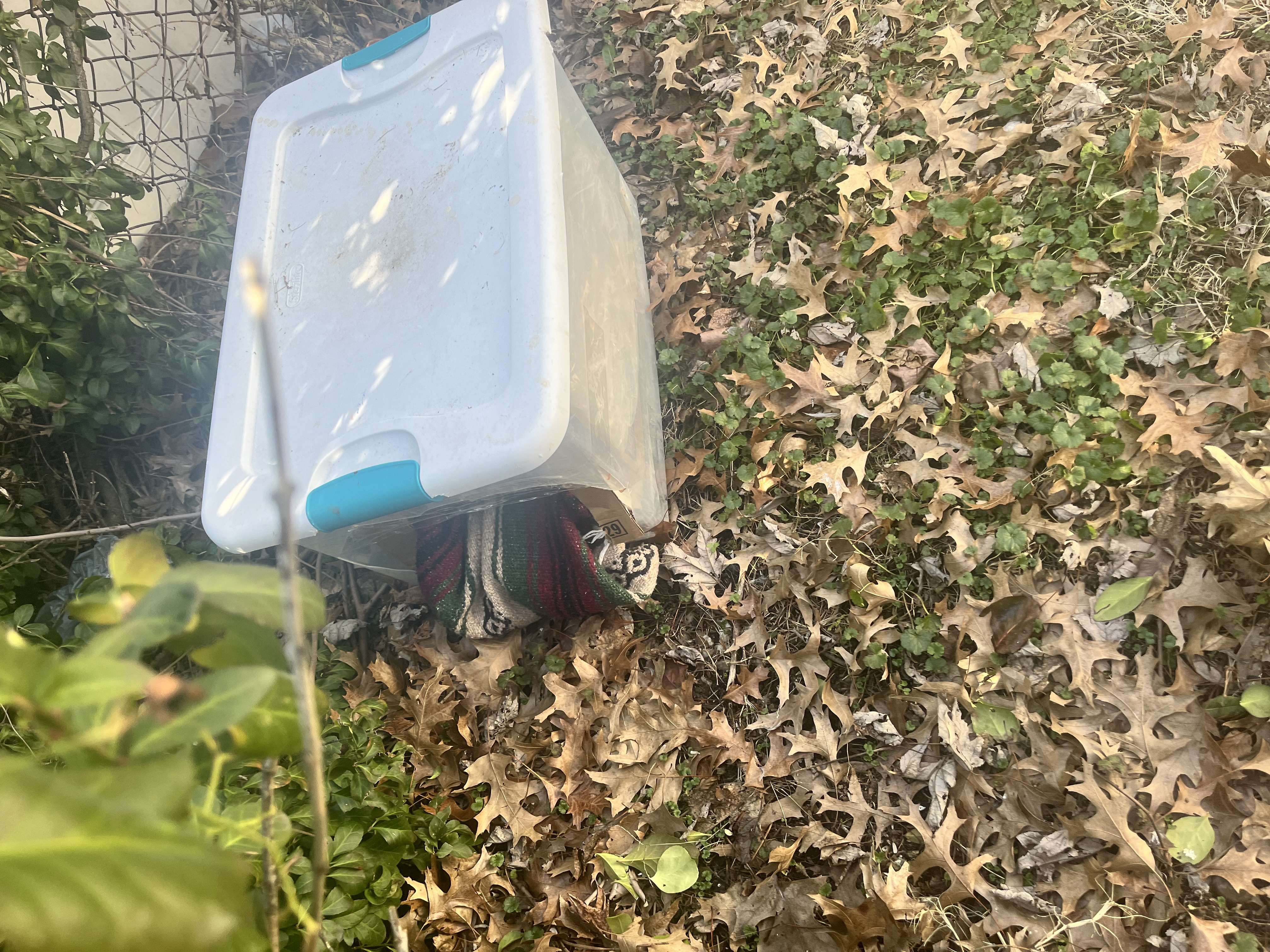 There is a large black cat that has been living in my bush all year. He eats well. He will approach you, but you will not approach him. He has green eyes, and is pure black. I will take a pic, but in the meantime...it is supposed to snow a foot and ice and get very cold, so I made Black Cat this shelter. I made a box in a box in a box with layers on all sides and thicc warm covers.