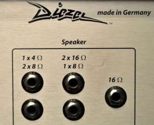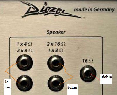 You can use either of those two, the bottom right or the top right. Those two are both 8 ohm jacks. What the 2x16ohm means is that if you had TWO Marshall or VHT cabs that are 16ohm, you would plug BOTH cabs into those two same 8ohm jacks If you had just ONE Marshall or VHT cab rated at 16ohms, you would plug it into the single 1x16ohm jack all the way to the right in the first pic.