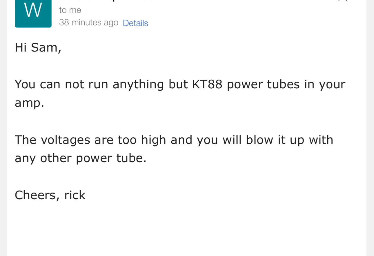 So if you like EL34's the KT88's might float your boat and if you like 6L6's then the 6550's might be your tube.