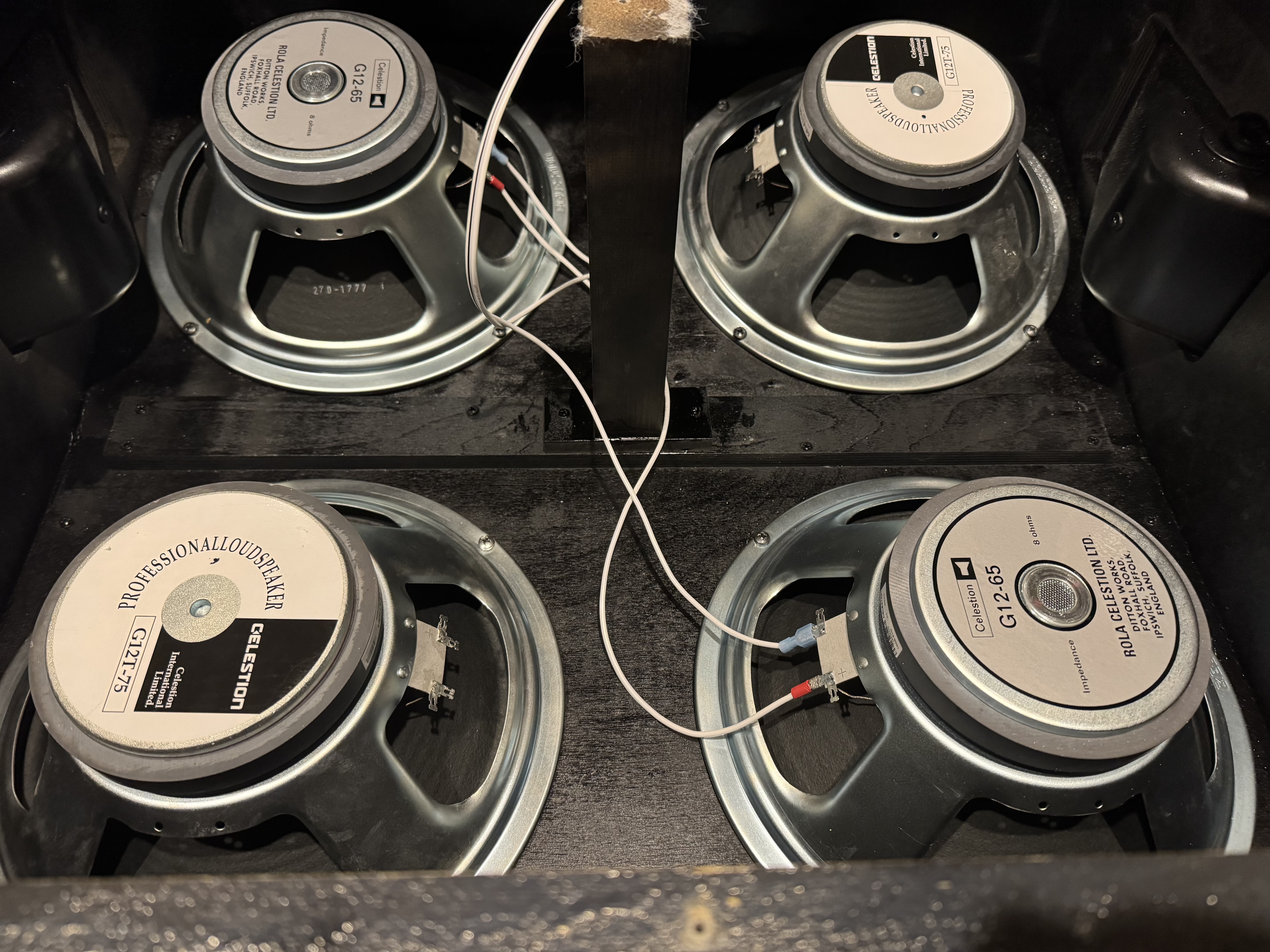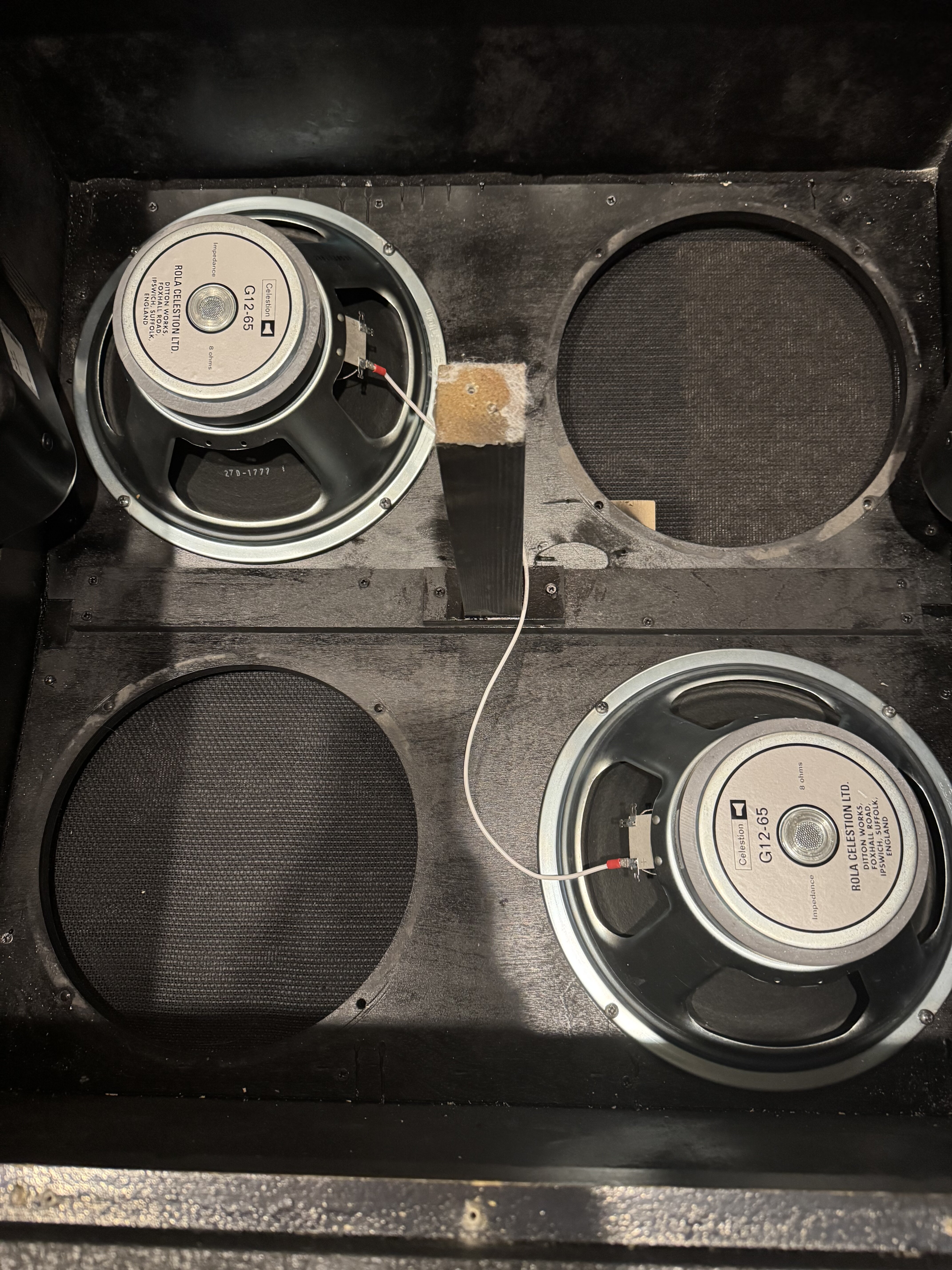 I then got to playing around and hooked up some Weber 65 clones in the other holes…..it didn’t sound near as good. Then moved the Heritage 65’s up top and left bottom holes open……didn’t sound as good. Then put “dummy” speakers (unhooked) in bottom holes…..,,,still didn’t sound as good.