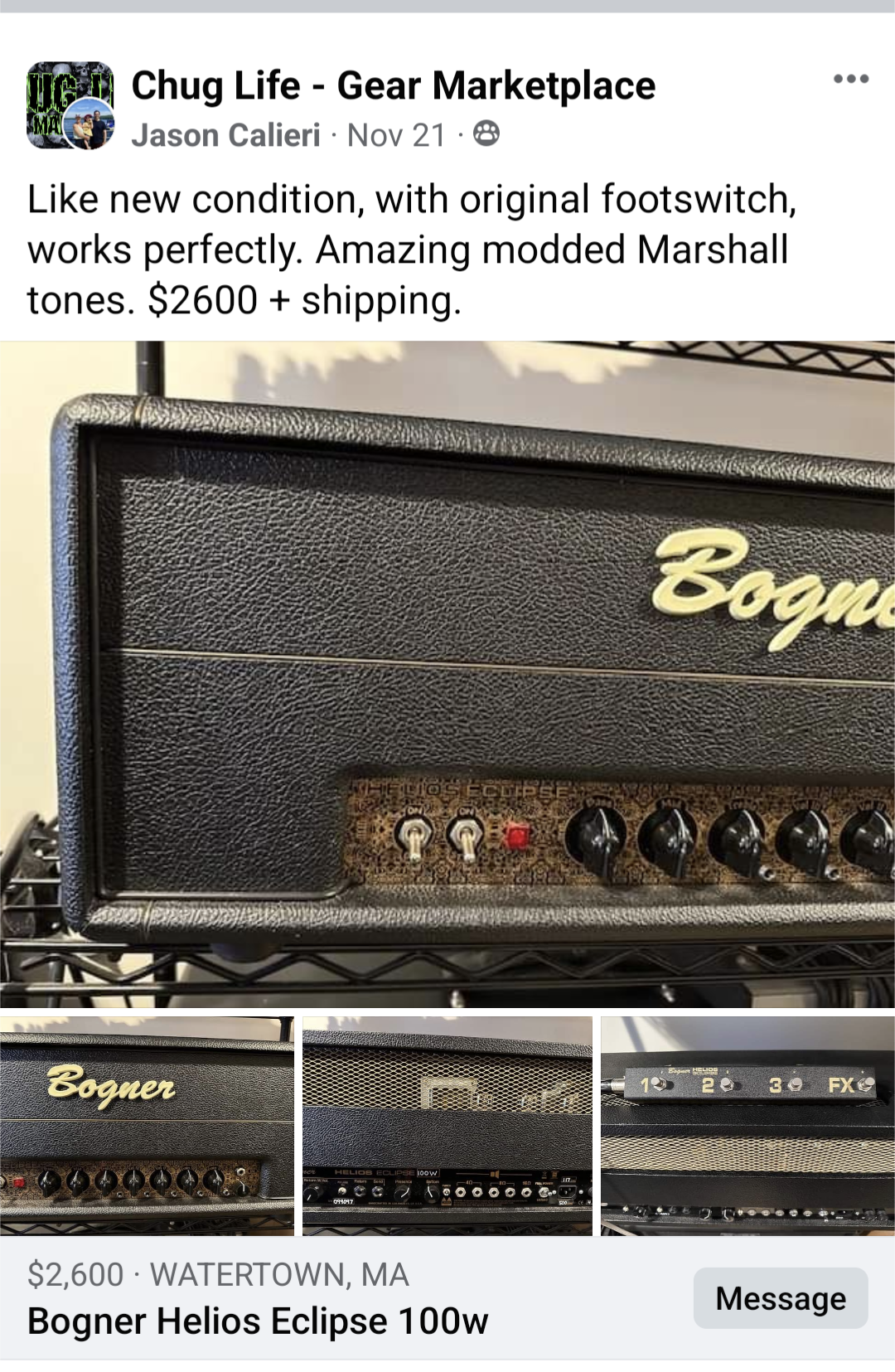 Hey y'all, I'm looking for a Bogner Helios Eclipse if anyone has one they're open to letting go. Hoping to pay in the $2500 range. Hit me up with what you've got! Thanks.