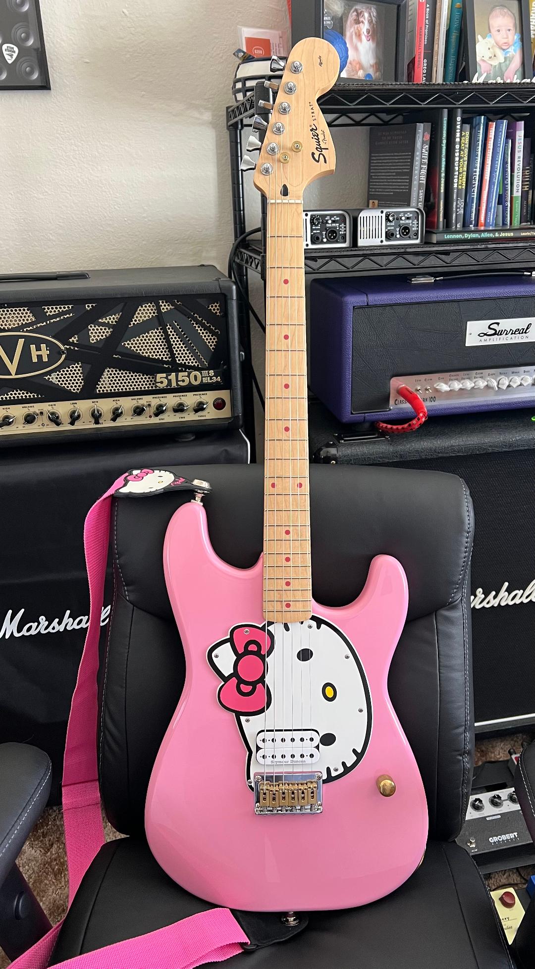 I upgraded all electronics, EVH 500K LF Pot, Switchcraft Input Jack, Duncan Full Shred pickup. Added Hipshot Locking Tuners, Tusq Nut, did the Charvel brass knob, jack plate, string trees and saddles. Dunlap strap locks and all stainless steel screws. Started off as a joke, but turned into a really killer playing and sounding Strat.What mods have you done to Hello Kitty? I have one that I swapped all the hardware and pickup.