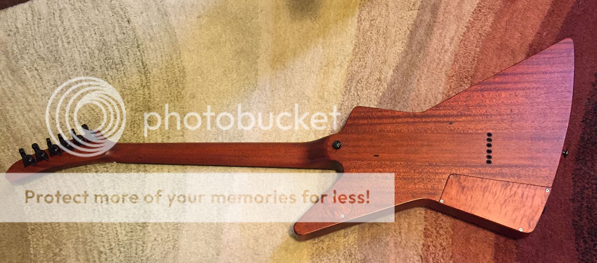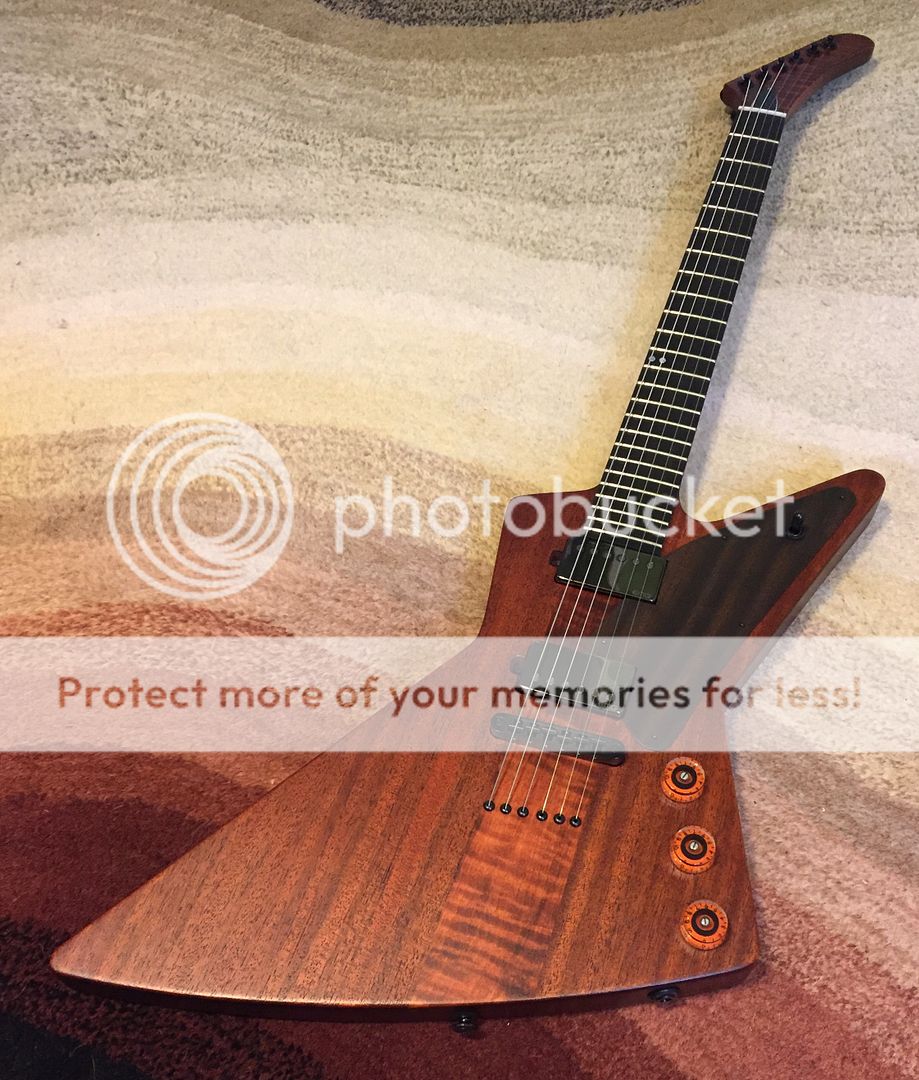 So back on May I happened to score a second hand Carvin neck blank for a hundred bucks. And, since I work in a wood shop, I traced out my buddy's Gibson Explorer Pro, and got to work. It turned out really well overall, but being 24 frets and a 25-1/2" scale, it feels a bit different than a Gibson. I really didn't want to have a pickguard, but trying to drill wiring holes was a bitch!